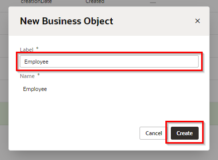 「New Business Object」 ポップアップ・ボックスが表示されたら、 以下の内容を設定して、 「Create」 ボタンをクリックします。
