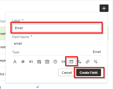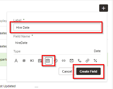 ポップアップ・ボックスが表示されたら、追加するフィールドの設定を次の表のように設定し、 「Create Field」 ボタンをクリックします。