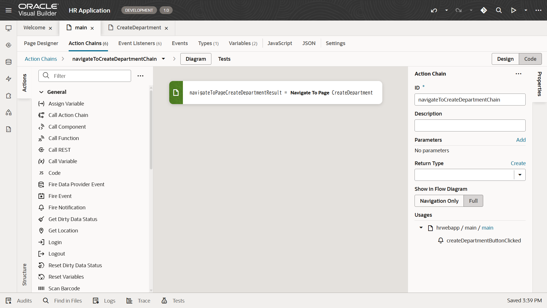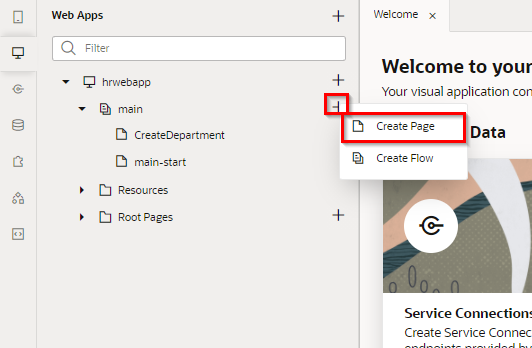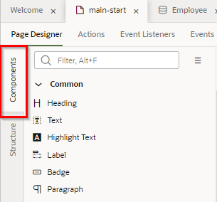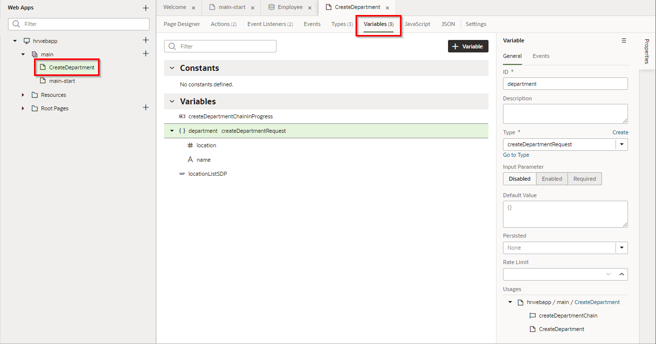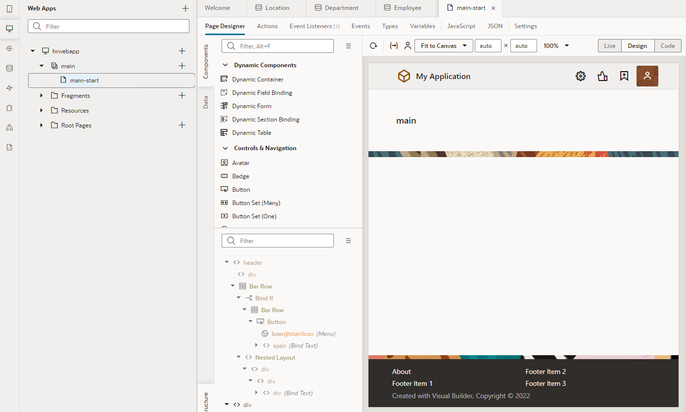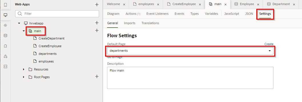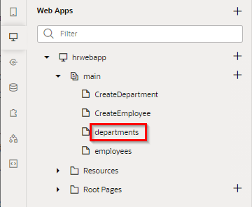 「hrwebapp」 → 「main」 ノードを展開して、 「Departments」 ページを開きます。 アプリケーション・デザイナの Page Designer タブ・ページで開きます。