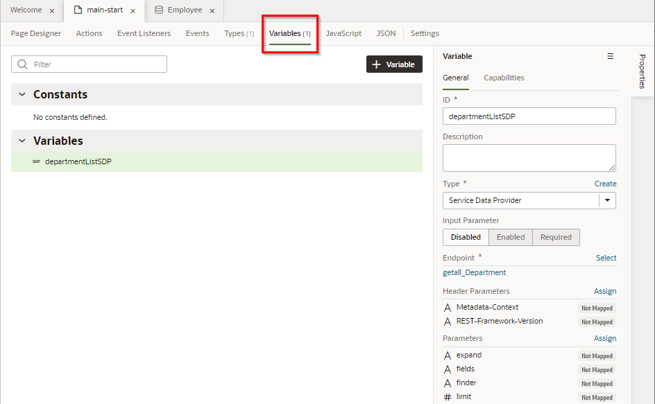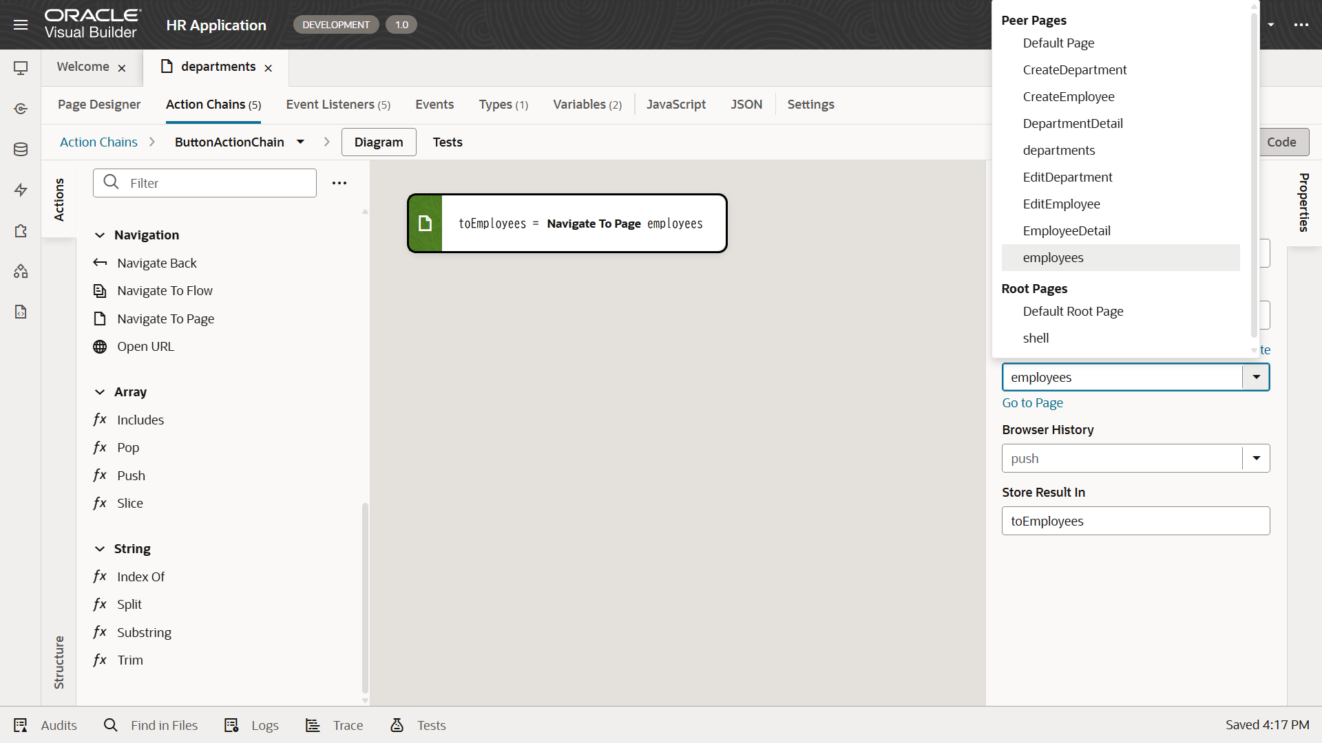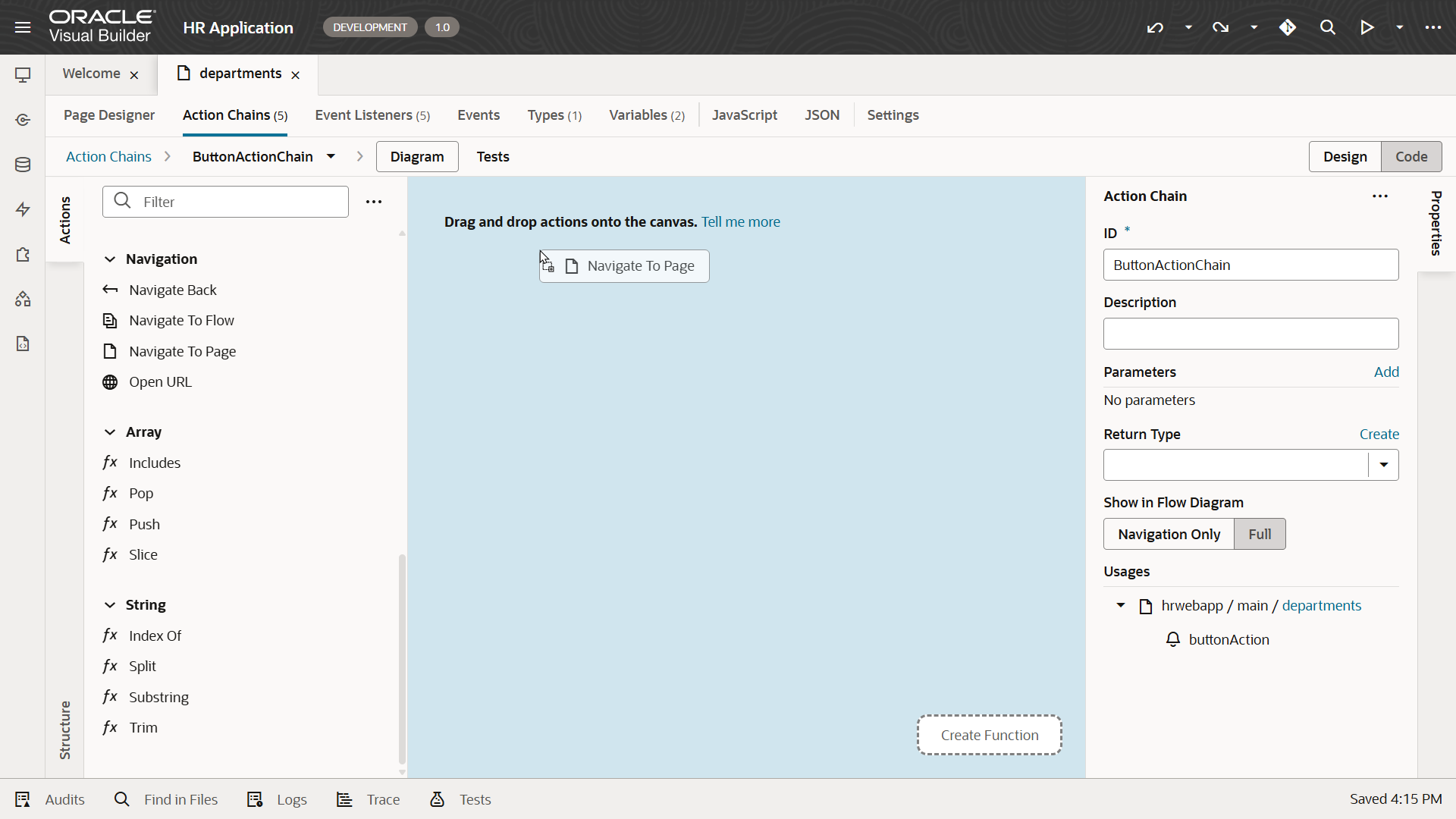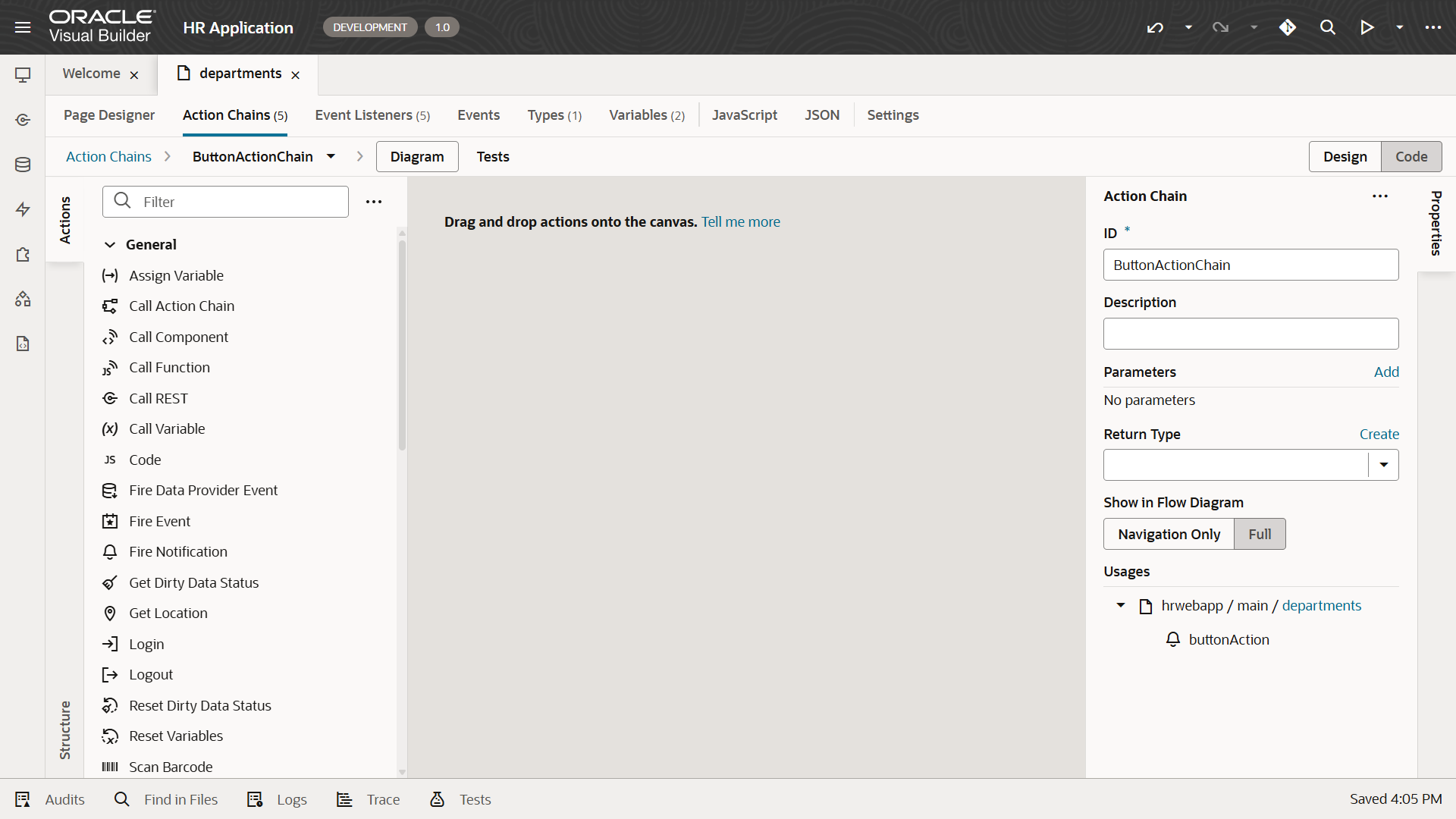 「hrwebapp」 → 「main」 ノードを展開して、 「Departments」 ページを開きます。 アプリケーション・デザイナの Page Designer タブ・ページで開きます。