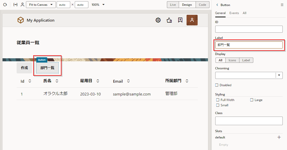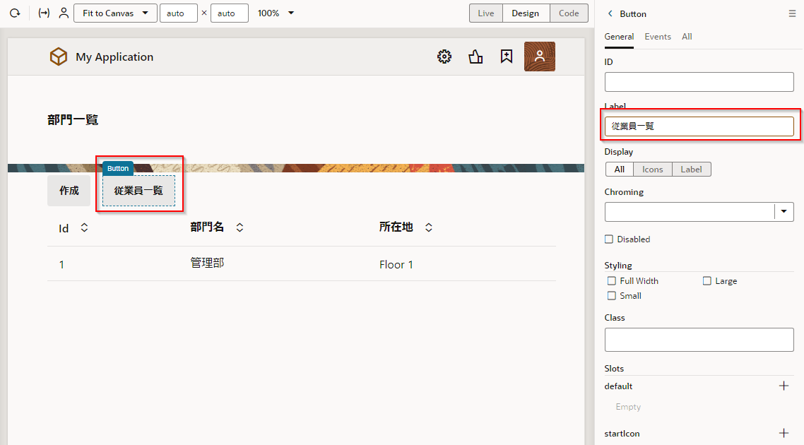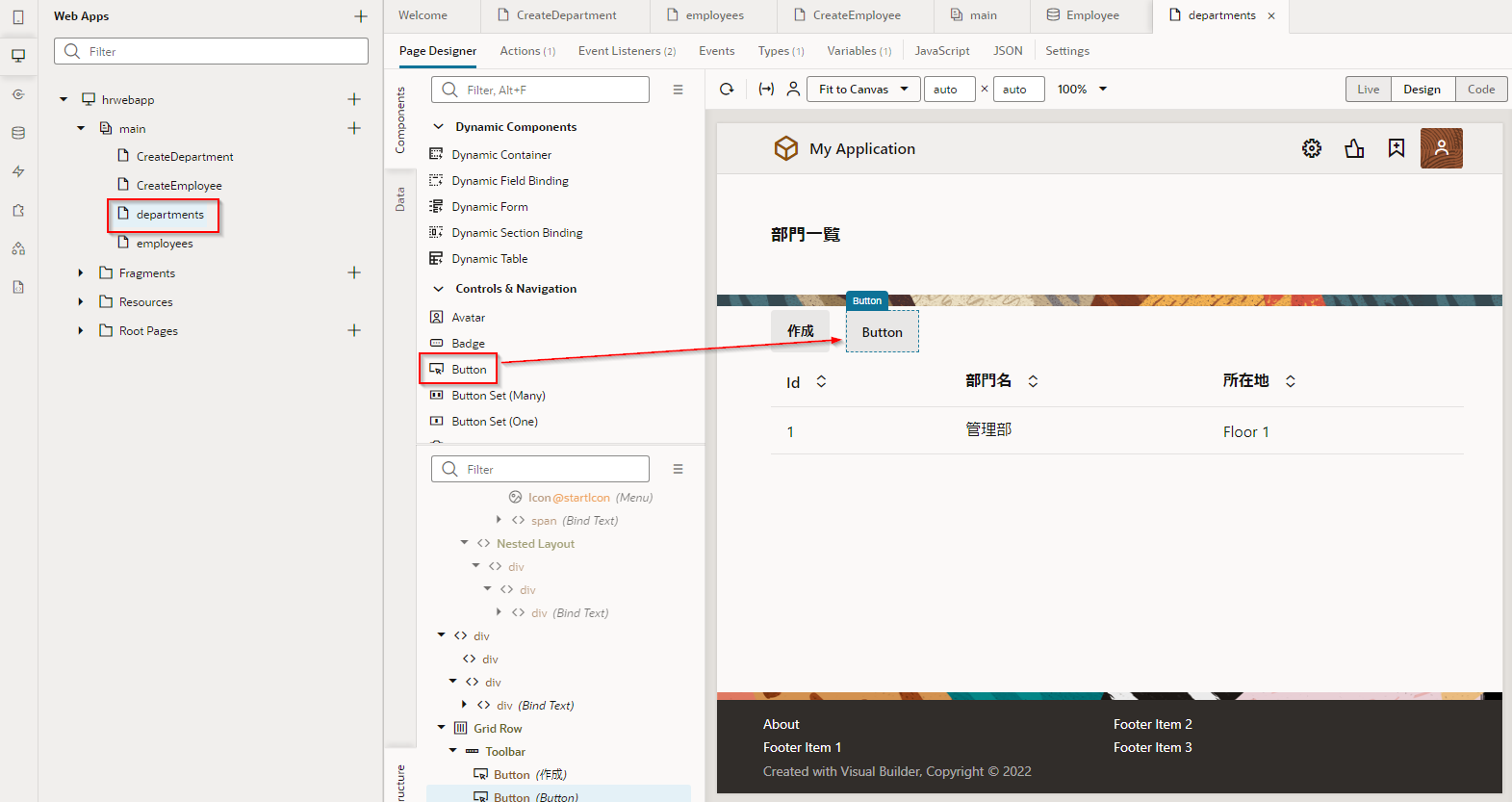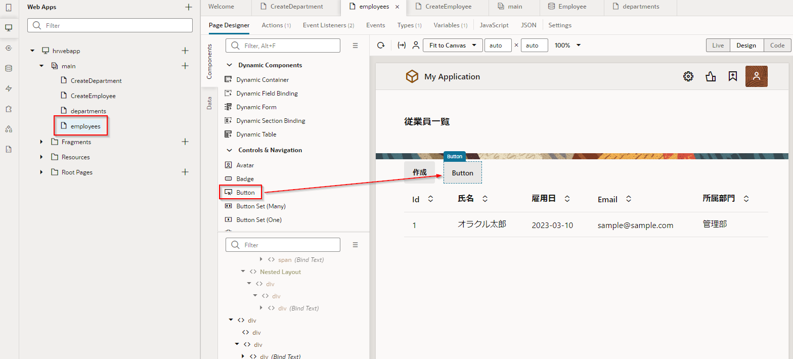 ここでは、Departments (部門一覧)ページに、「従業員一覧」 ボタンを追加します。 「従業員一覧」 ボタンをクリックすると Employees ページ(従業員一覧)にナビゲートするように設定します。