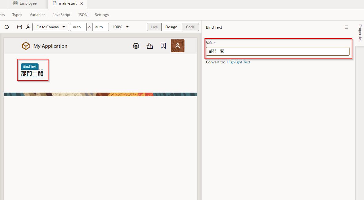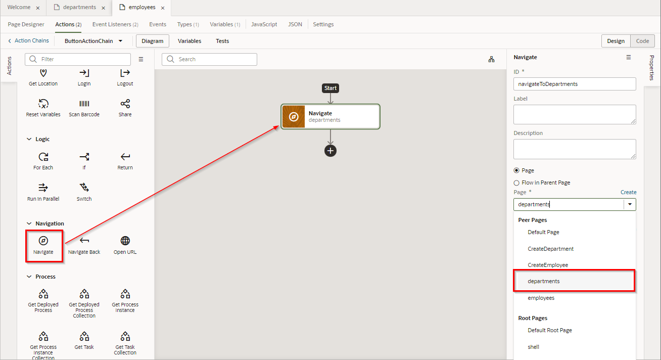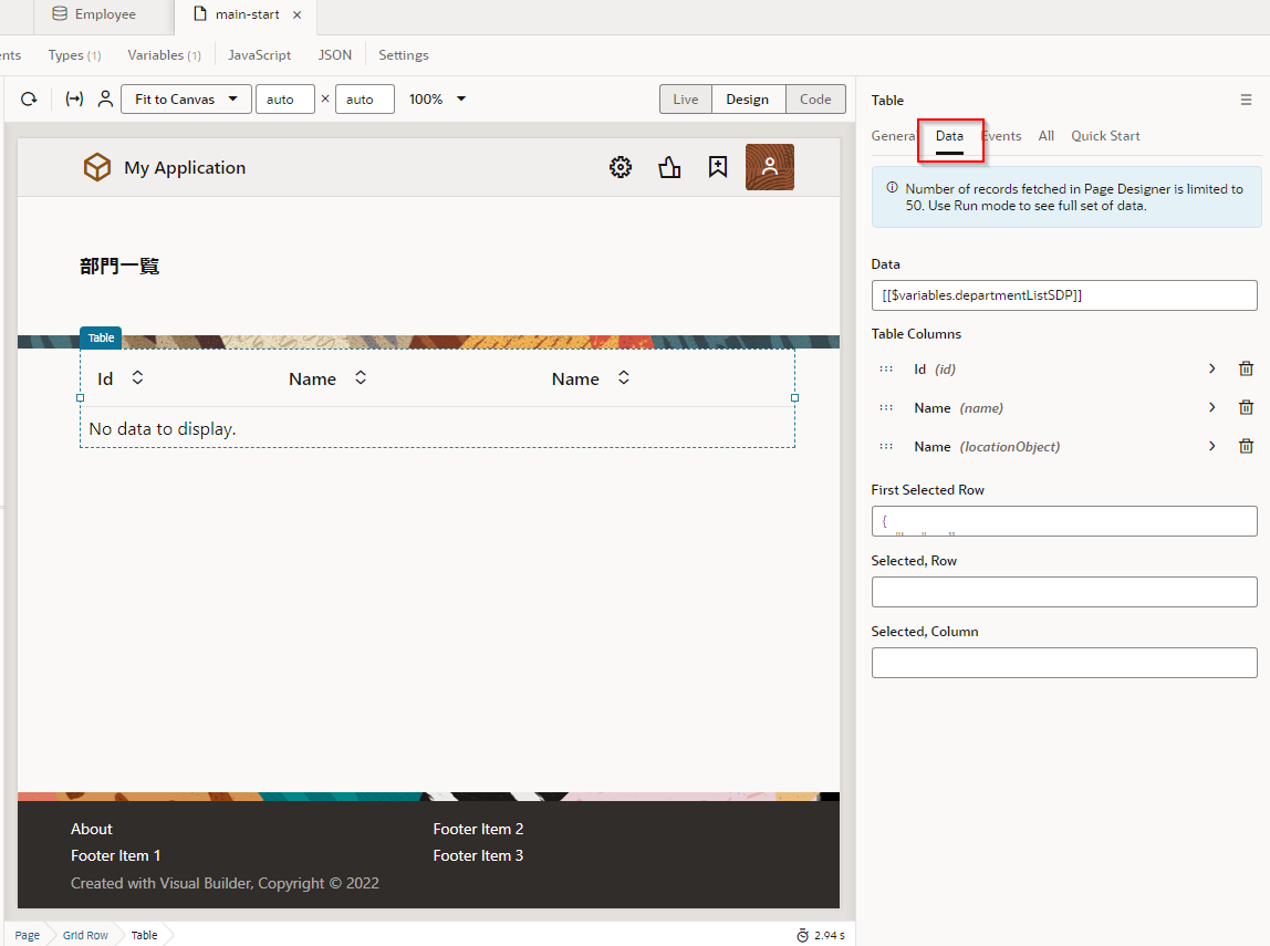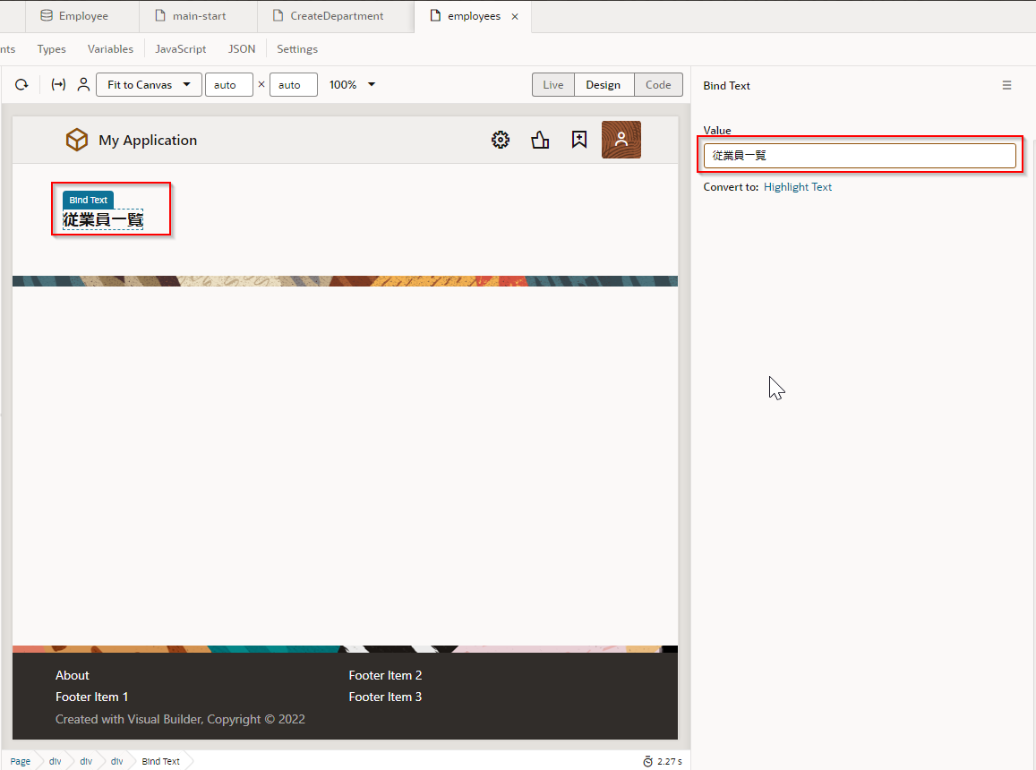 ここでは、Departments (部門一覧)ページに、「従業員一覧」 ボタンを追加します。 「従業員一覧」 ボタンをクリックすると Employees ページ(従業員一覧)にナビゲートするように設定します。