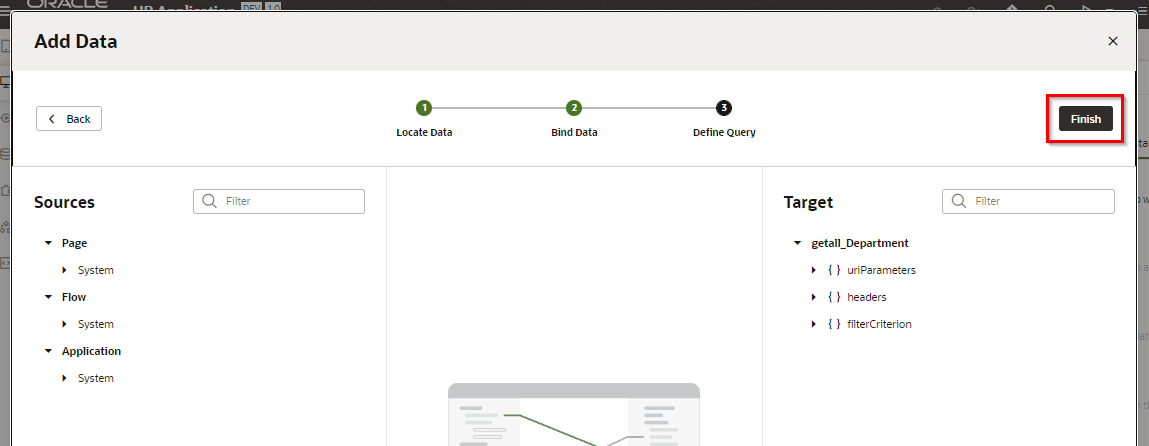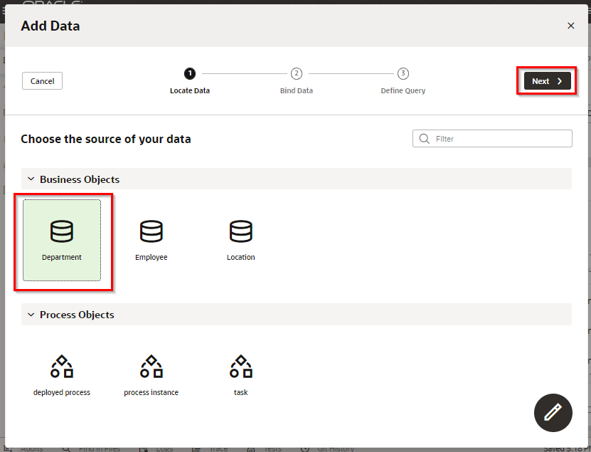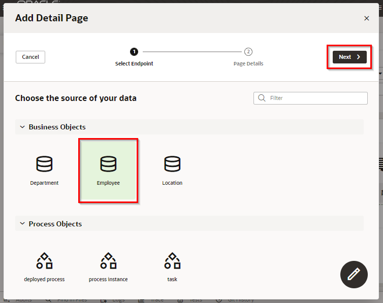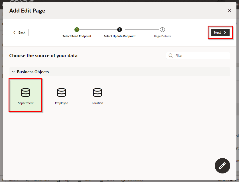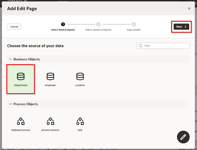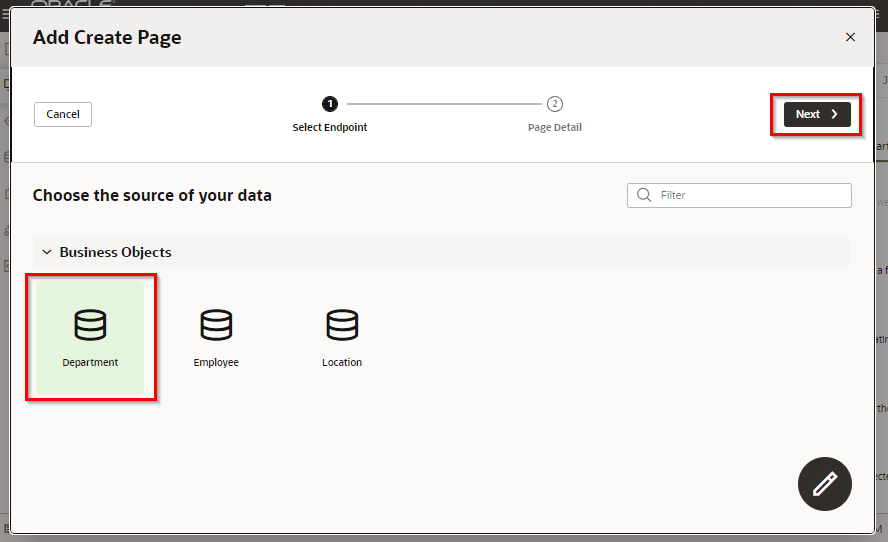 「Add Edit Page」 ダイアログ・ボックスが表示されます。 「Select Endpoint」 ページでは、編集するレコードのデータを取得する際にコールする REST エンドポイントを指定します。 「Business Objects」 → 「Department」 を選択します。 「Next」 ボタンをクリックします。