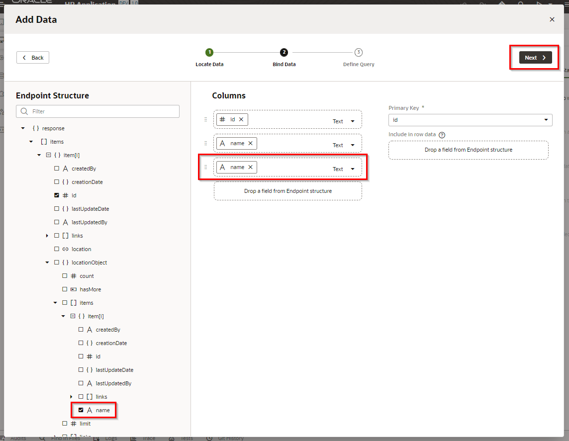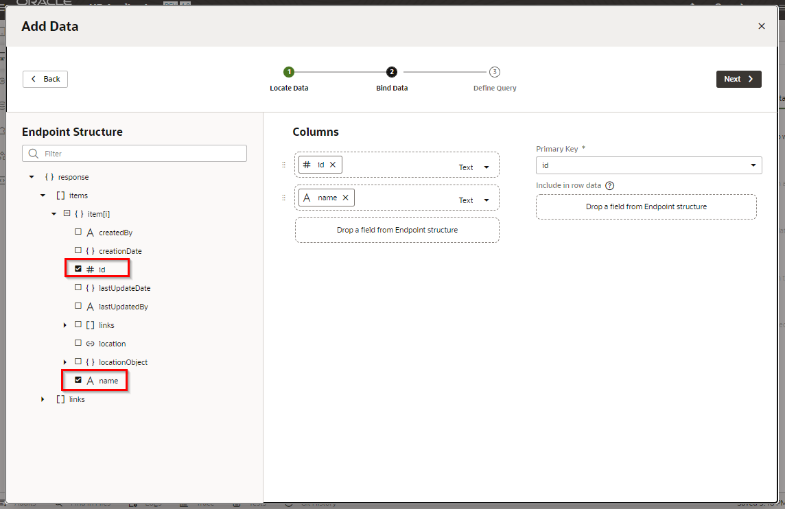 「Page Details」 ページでは、ページに表示するビジネス・オブジェクトのフィールドを選択します。 最初に、 画面左側(Endpoint Structure) で 「response」 ツリーの一番下に表示されている 「name」 をチェックします。