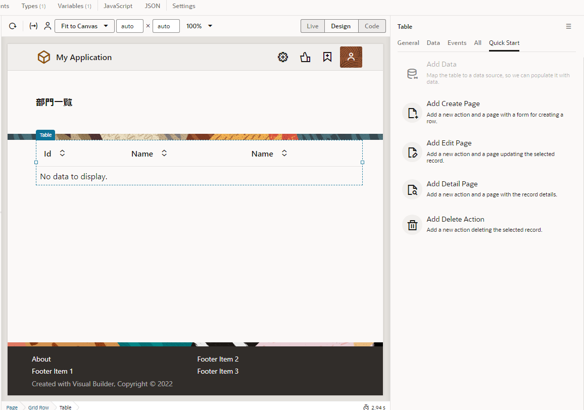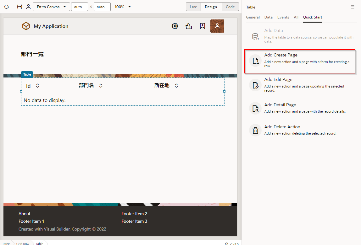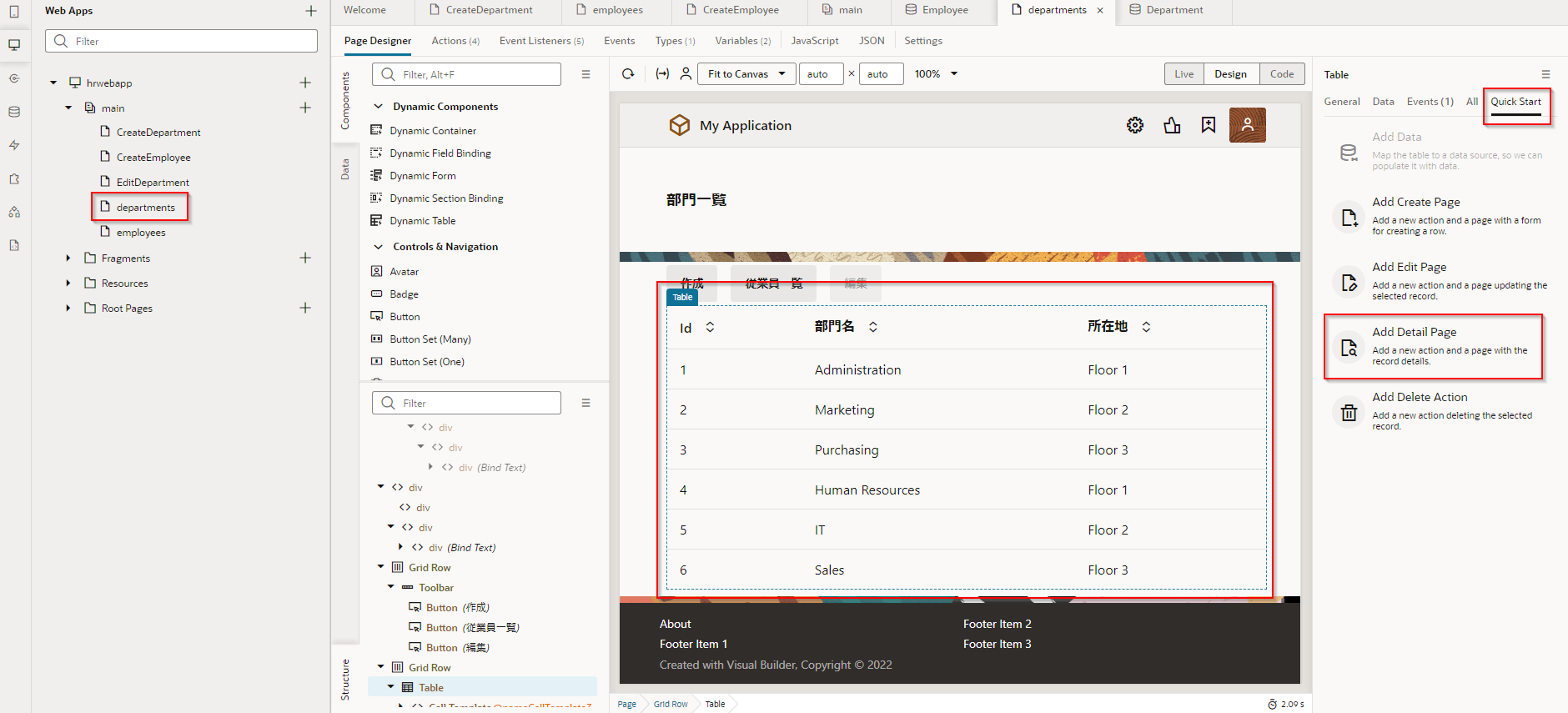 アプリケーション・デザイナで Departments (部門一覧)ページを開き、『Department のレコードの一覧を表示するテーブルの追加』 で追加した Table コンポーネントを選択します。 Table コンポーネントのプロパティ・インスペクタで Quick Start タブから、「Add Detail Page」 をクリックします。