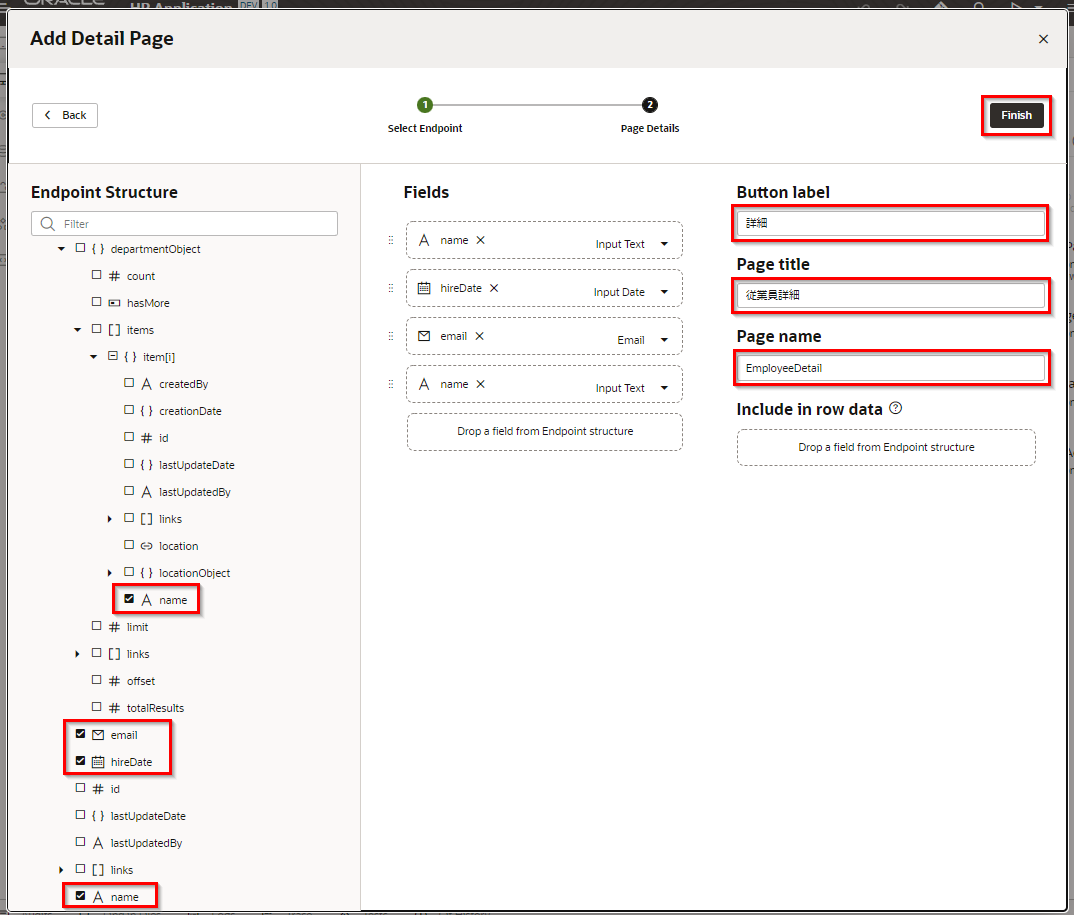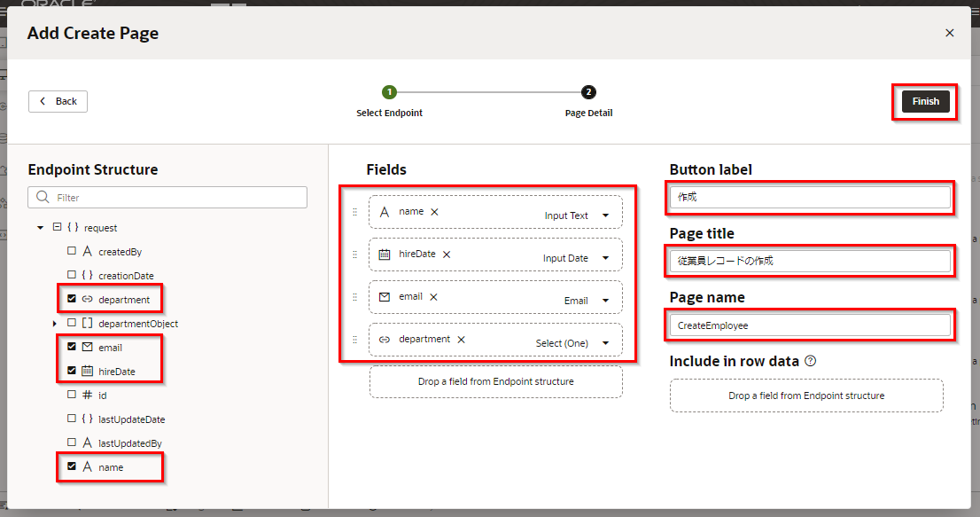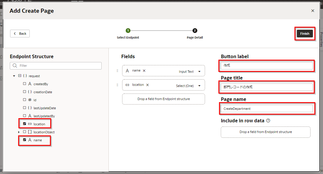 「Page name」 は「DepartmentDetail」を入力します。 「Finish」 ボタンをクリックします。
