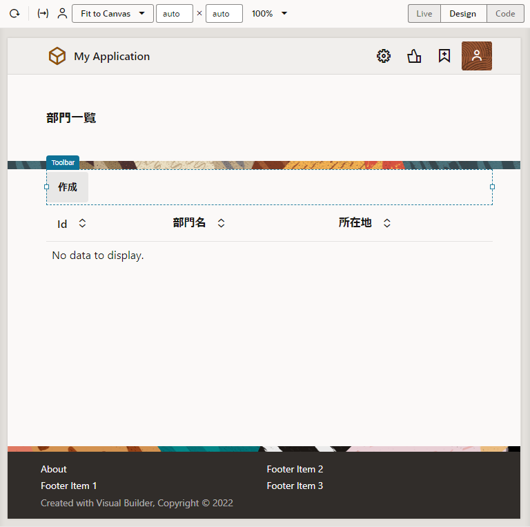 「Add Create Page」 ダイアログ・ボックスで 「Finish」 ボタンをクリックすると、main-start ページの Heading コンポーネントと Table コンポーネントの間に Toolbar コンポーネントが追加されています。 Toolbar コンポーネントの中には、「作成」 ボタンが配置されています。