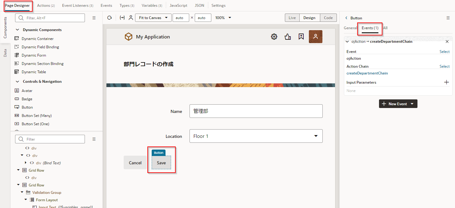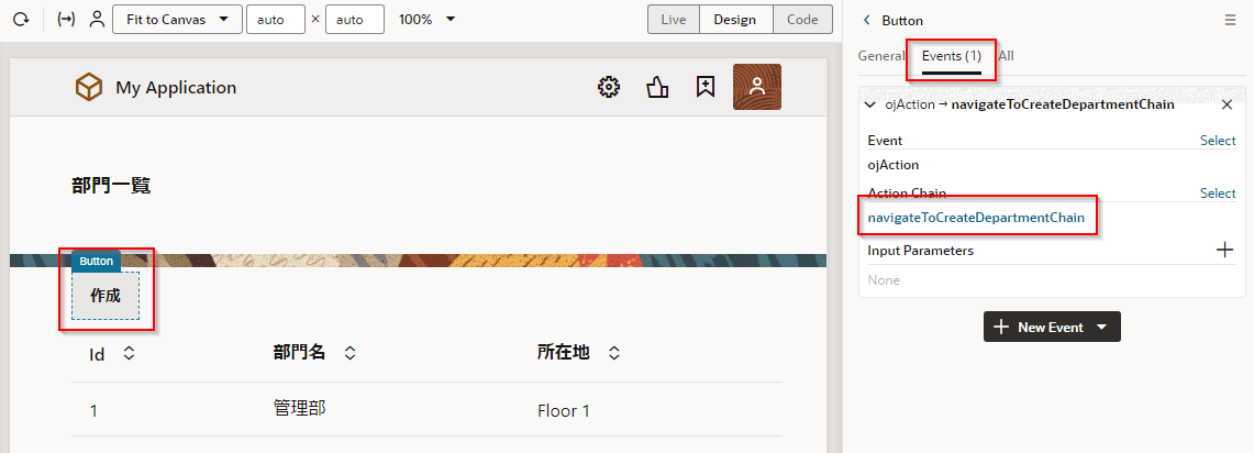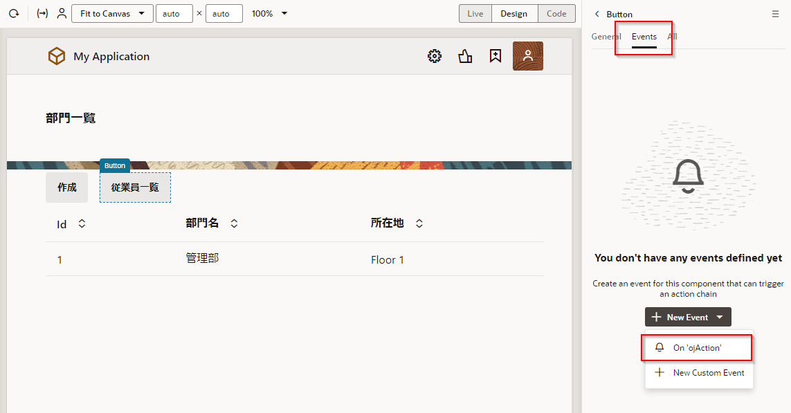 「部門一覧」 ボタンのプロパティ・インスペクタで、 「Events」 タブ・ページを開きます。 「+ New Event」 ボタンをクリックすると表示されるメニューから 「On ‘ojAction’」 を選択します。