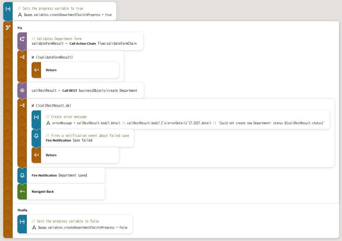 これにより、「従業員一覧」 ボタンがクリックされた時に起動される、 Id が ButtonClickAction のアクション・チェーンが定義されます。