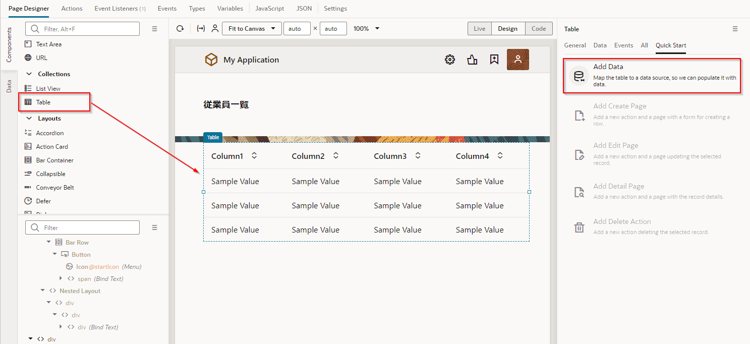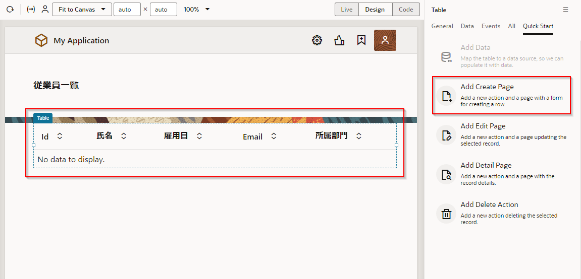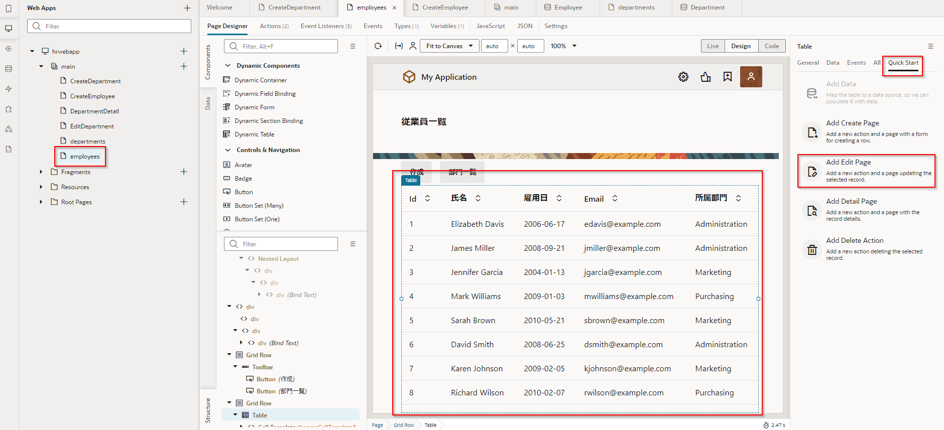 アプリケーション・デザイナで Employees(従業員一覧)ページを開き、『Employee のレコードの一覧を表示するページの追加』 で追加した Table コンポーネントを選択します。 Table コンポーネントのプロパティ・インスペクタで Quick Start タブ をクリックし、「Add Edit Page」 をクリックします。