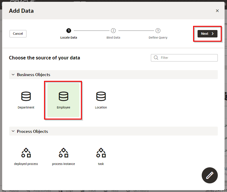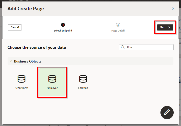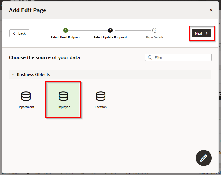 「Add Edit Page」 ダイアログ・ボックスが表示されます。 「Select Endpoint」 ページでは、編集するレコードのデータを取得する際にコールする REST エンドポイントを指定します。 「Business Objects」 → 「Employee」 を選択します。 「Next」 ボタンをクリックします。