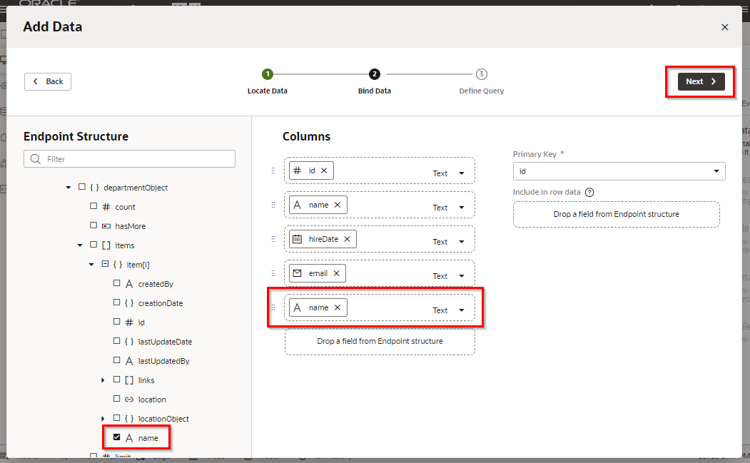 「Endpoint Structure」 で 「name」 と 「hireDate」、「email」、「department」 を順番にチェックします。