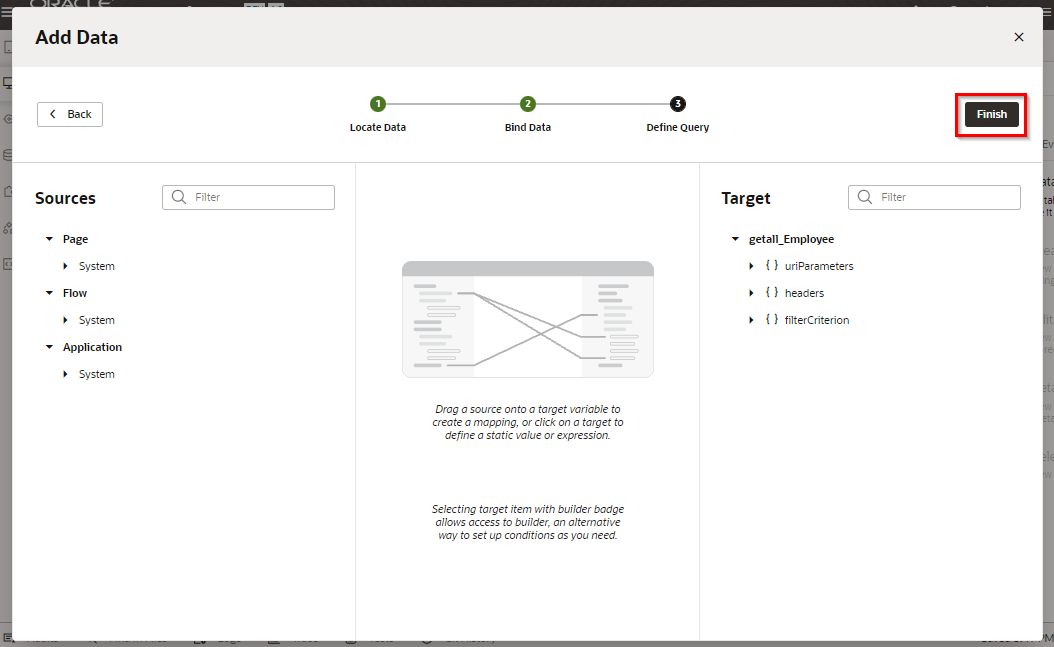 「Add Delete Action」 ダイアログ・ボックスが表示されます。 「Select Endpoint」 ページでは、レコードを削除する際にコールする REST エンドポイントを指定します。 「Business Objects」 → 「Employee」 を選択します。 「Finish」 ボタンをクリックします。