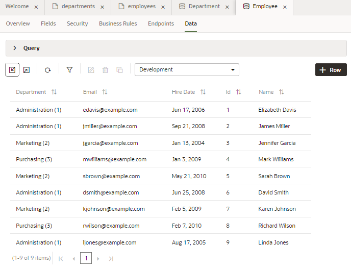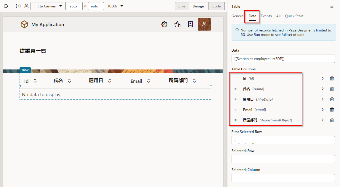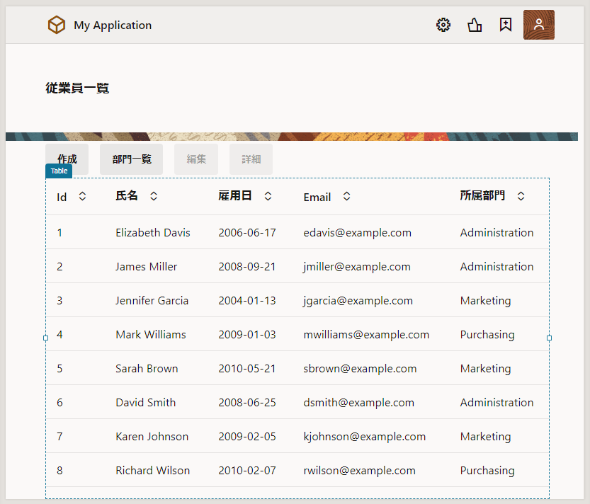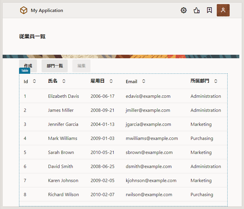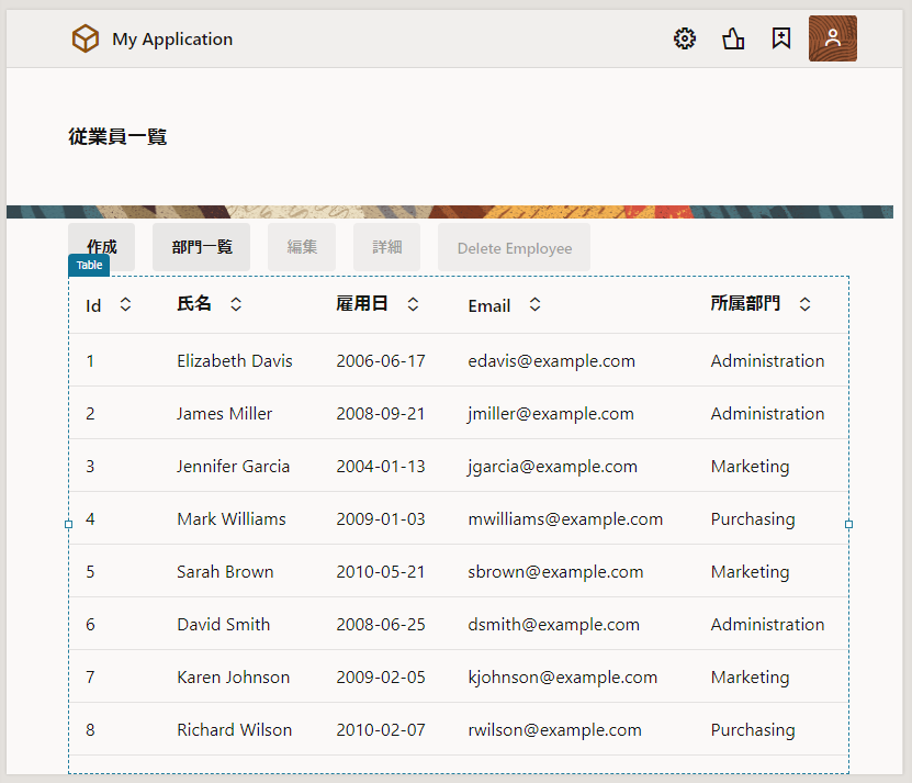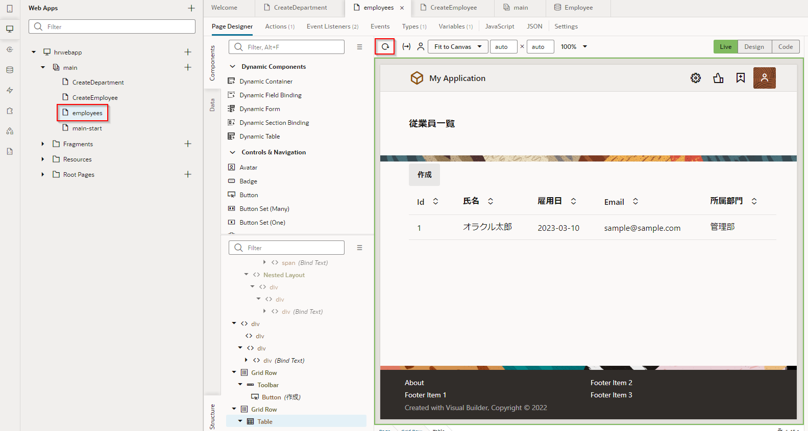 Employees(従業員一覧) ページをアプリケーション・デザイナで開いて追加したデータを確認します。 テーブルにこのセクションで追加したデータが表示されない場合は、 Reload Page ボタン