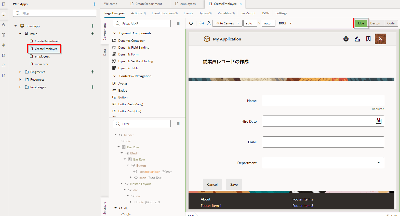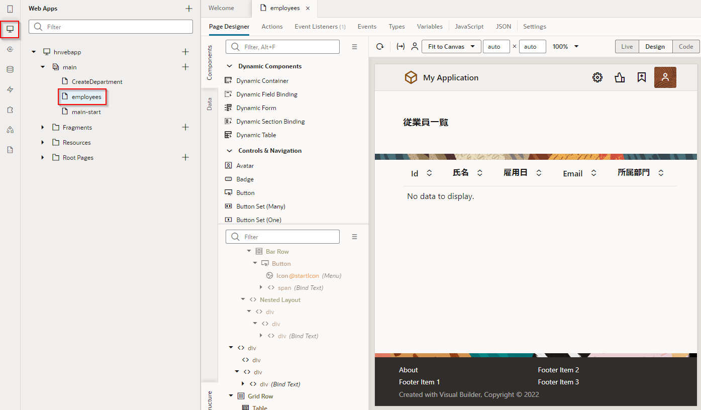 アーティファクト・ブラウザで 「CreateEmployee」 ページをクリックし、アプリケーション・デザイナで開きます。