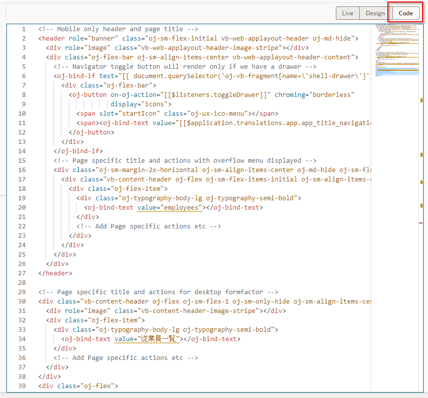 画面右上にある 「Code」 ボタンをクリックすると、Employees ページの HTML ソースを確認したり、直接編集したりすることができます。