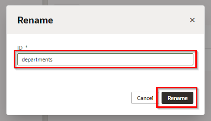 「Rename」 ダイアログ・ボックスが表示されたら、 「Id」 を main-start から departments に変更し、 「Rename」 ボタンをクリックします。