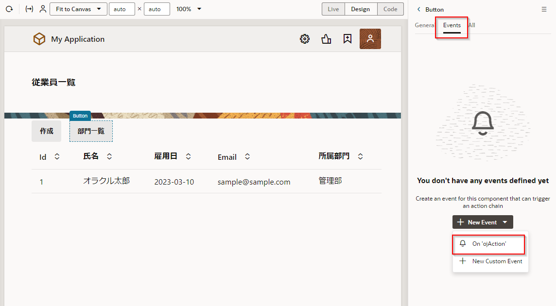 「従業員一覧」 ボタンのプロパティ・インスペクタで、 「Events」 タブ・ページを開きます。 「+ New Event」 ボタンをクリックすると表示されるメニューから 「On ‘ojAction’」 を選択します。
