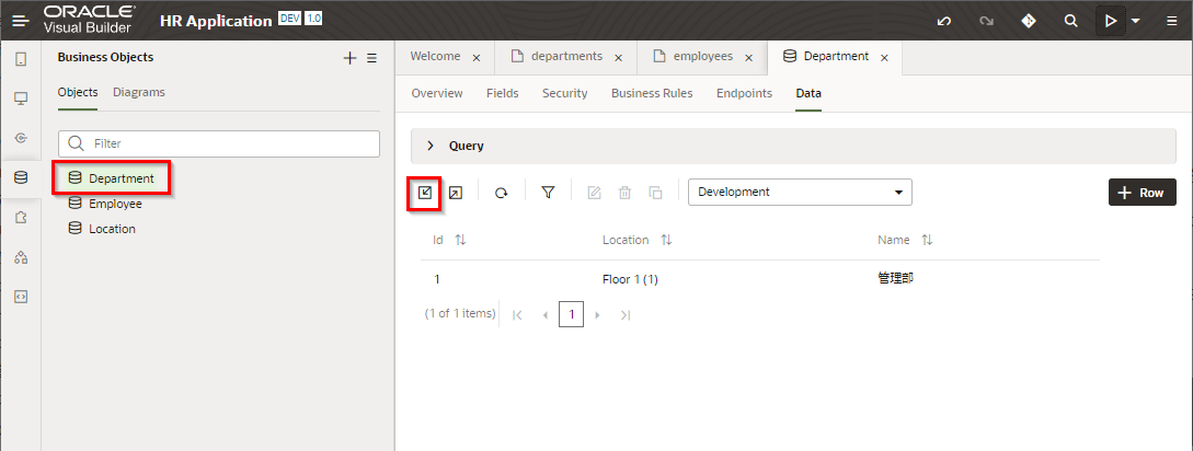 アーティファクト・ブラウザで Business Objects から「Department」 を選択してアプリケーション・デザイナで開きます。 「Data」 タブ・ページで Import from File アイコン