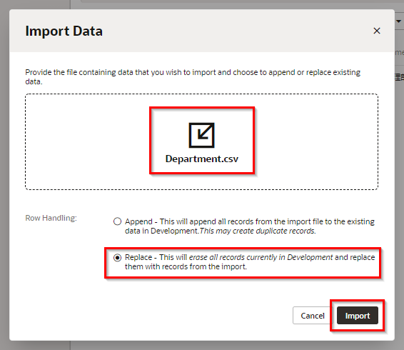 ダイアログ・ボックスの中央にある 「Upload a file or drag it here」 と書かれたボックスをクリックするとファイルを開くウィンドウが表示されるので、このパートでダウンロードした Department.csv を開き(またはファイルをドラッグ&ドロップ)、 「Import」 ボタンをクリックします。