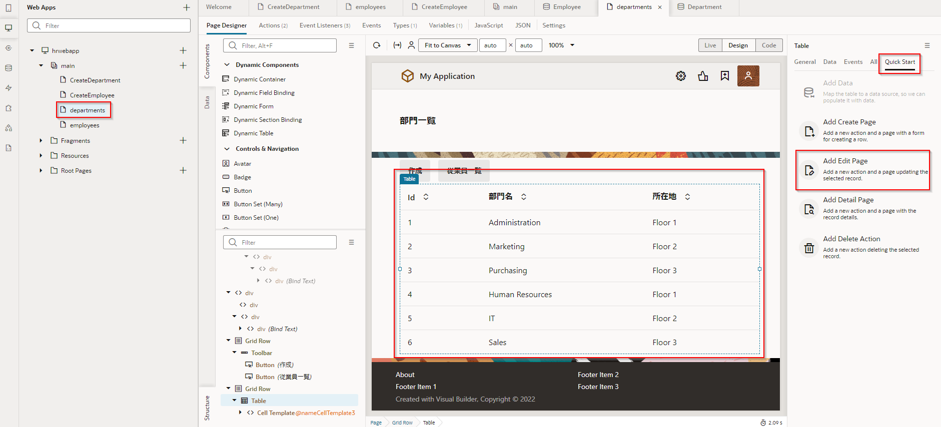 アプリケーション・デザイナで Departments(部門一覧)ページを開き、『Department のレコードの一覧を表示するテーブルの追加』で追加した Table コンポーネントを選択します。 Table コンポーネントのプロパティ・インスペクタで Quick Start タブ をクリックし、「Add Edit Page」 をクリックします。