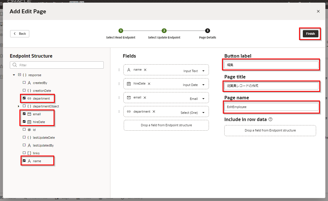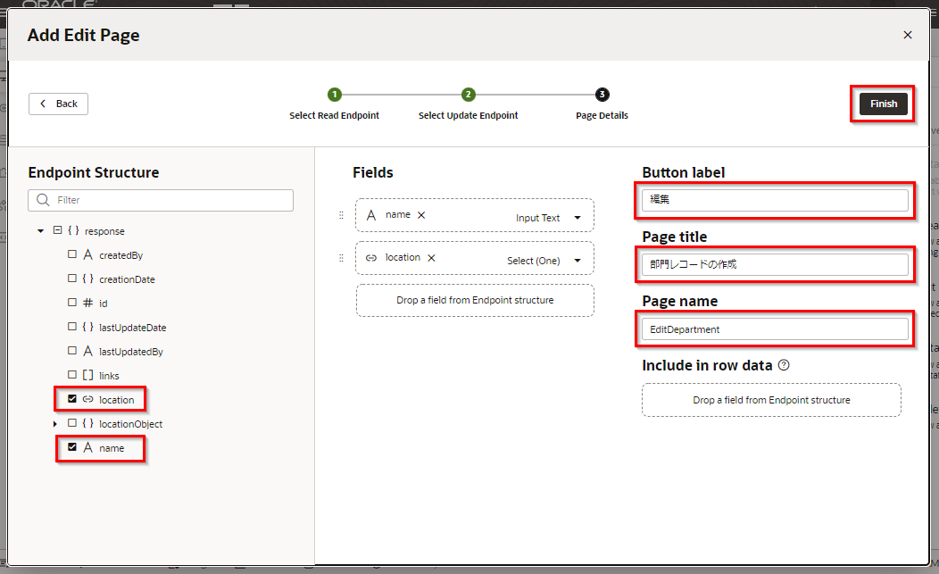 「Page name」 は「EditDepartment」を入力します。 「Finish」 ボタンをクリックします。