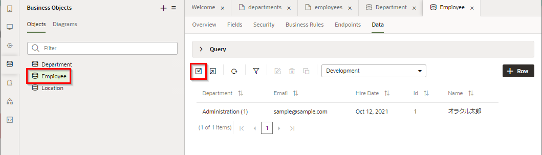 アーティファクト・ブラウザで Business Objectsタブから 「Employee」 をクリックしてアプリケーション・デザイナで開きます。 「Data」 タブ・ページで Import from File アイコン