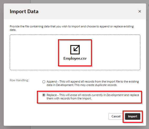 ダイアログ・ボックスの中央にある 「Upload a file or drag it here」 と書かれたボックスをクリックするとファイルを開くウィンドウが表示されるので、このパートでダウンロードした Employee.csv を開き(またはファイルをドラッグ&ドロップ)、 「Import」 ボタンをクリックします。