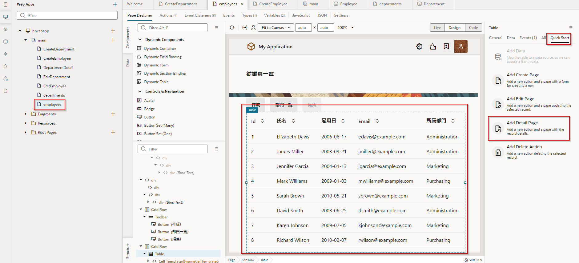 アプリケーション・デザイナで Employees(従業員一覧)ページを開き、『Employee のレコードの一覧を表示するページの追加』 で追加した Table コンポーネントを選択します。 Table コンポーネントのプロパティ・インスペクタで Quick Start タブ をクリックし、「Add Detail Page」 をクリックします。