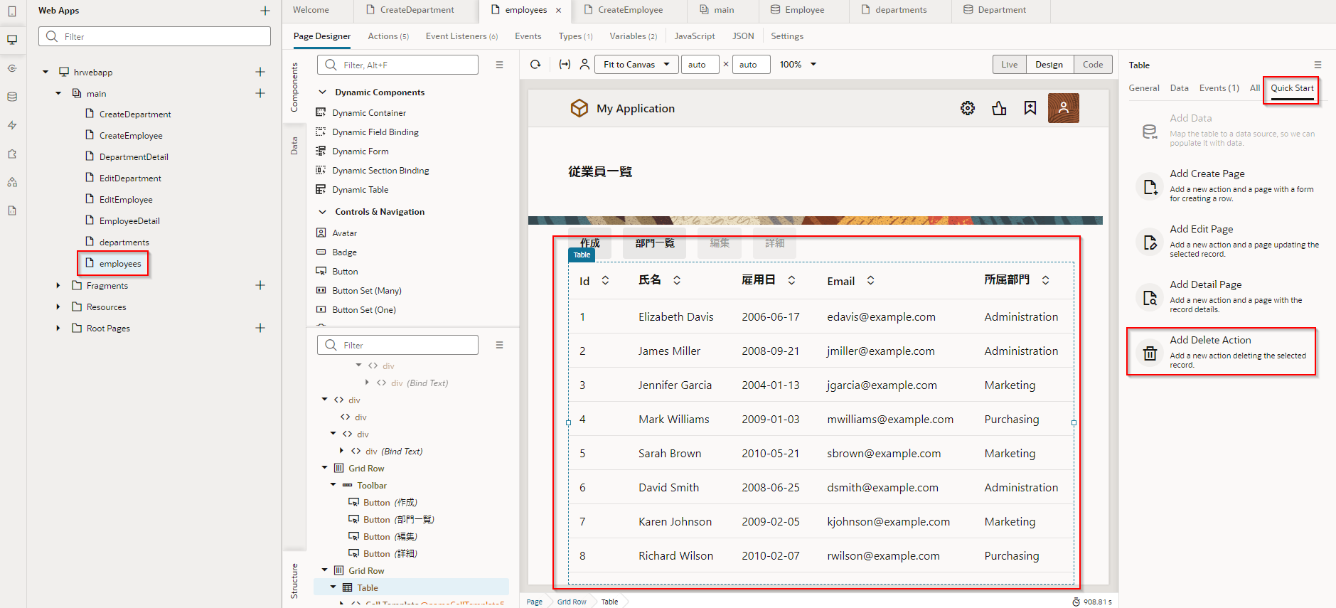 アプリケーション・デザイナで Employees(従業員一覧)ページを開き、『Employee のレコードの一覧を表示するページの追加』で追加した Table コンポーネントを選択します。 Table コンポーネントのプロパティ・インスペクタで Quick Start タブ をクリックし、「Add Delete Action」 をクリックします。