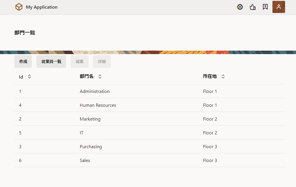 Employees (従業員一覧)ページの 「従業員一覧」 ボタンをクリックし、Departments (部門一覧)ページにナビゲートされることを確認します。
