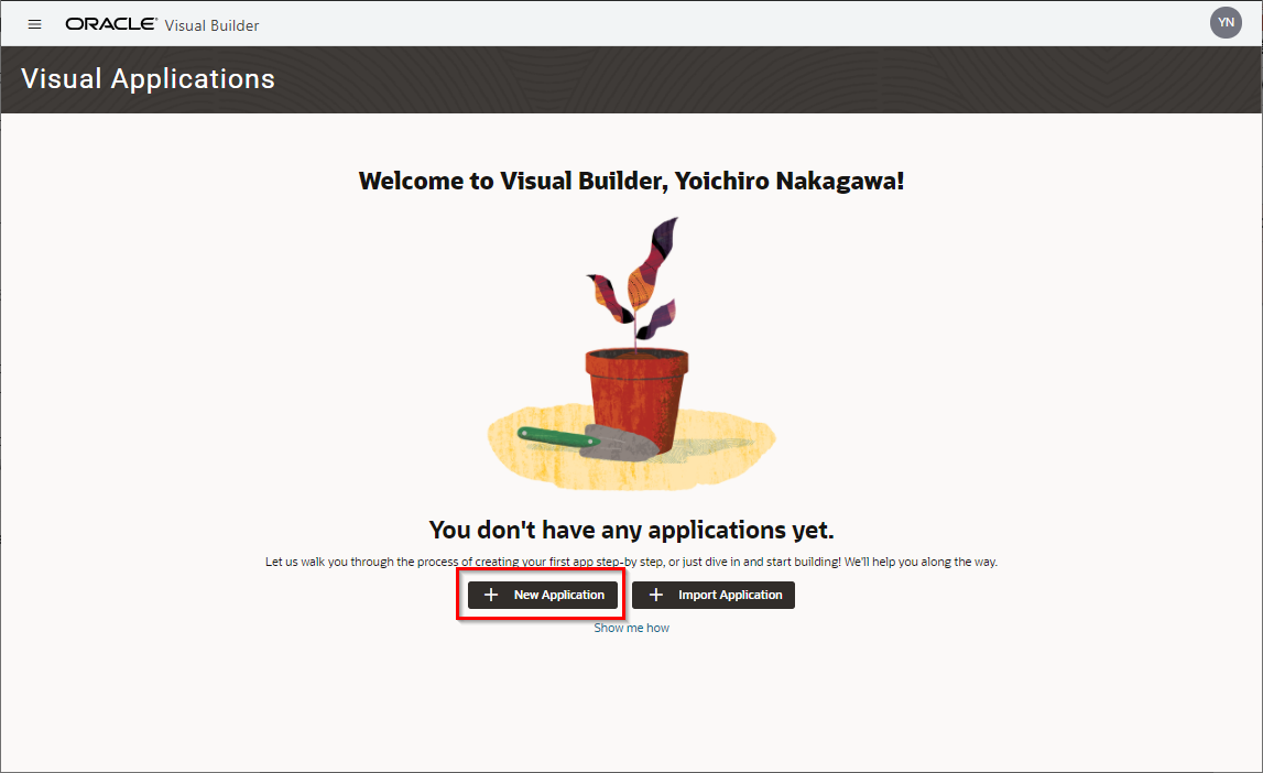 VBCS の 「Visual Applications」 ページが表示されたら、「New Application」 ボタンをクリックします。