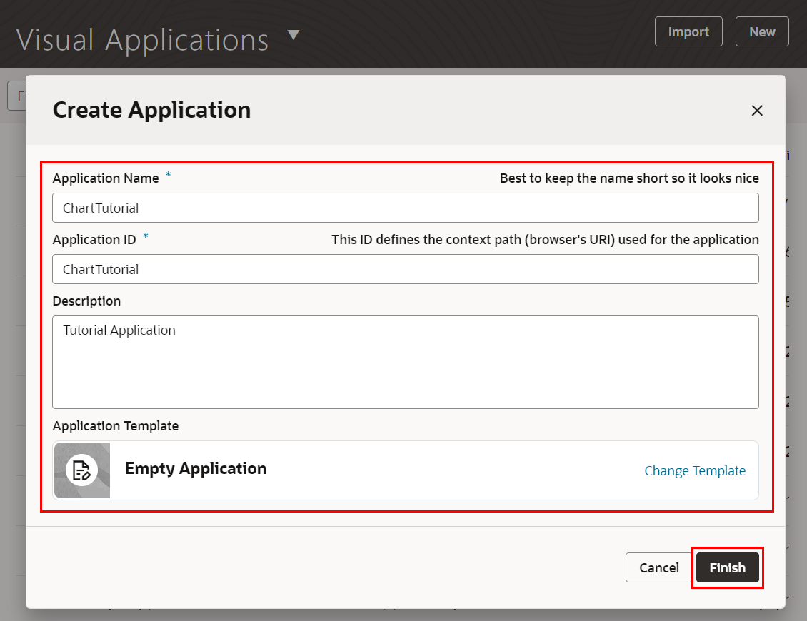 | 「Id」 | ChartTutorial | アプリケーションのID。アプリケーションの URL にも用いられるので、VBCSのインスタンス内で一意である必要があります。 |