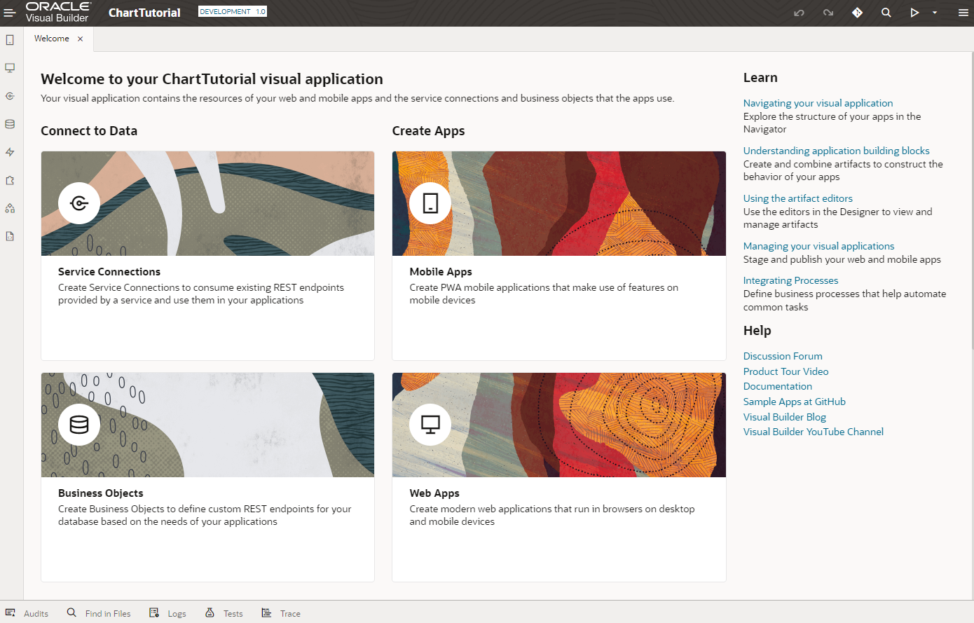 ビジュアル・アプリケーションが作成されると、VBCSのアプリケーション・デザイナでビジュアル・アプリケーションがオープンします。 アプリケーション・デザイナにはアーティファクト・ブラウザとWelcomeスクリーンが表示されます。 Welcomeスクリーンには、VBCSでアプリケーションを作成するためのタスクのガイドが表示されます。