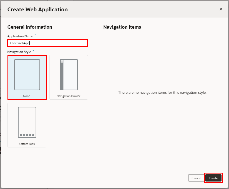 「Create Web Application」 ダイアログ・ボックスが表示されたら、 「Application Name」 フィールドに 「ChartWebApp」 と入力し、 Navigation Style に 「None」 を選択し、 「Create」 ボタンをクリックします。
