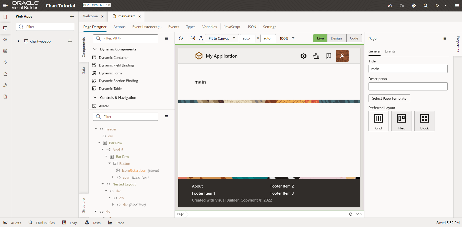 ChartWebAppアプリケーション のアーティファクトが生成されます。 ページ・デザイナで表示されている 「main-start」 が、アプリケーションの起動時に最初に表示される画面です。