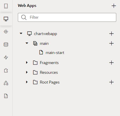 アーティファクト・ブラウザで 「chartwebapp」 ノードを展開するとWebアプリケーションの構造が表示されます。 「main」 ノードを展開すると 「main-start」 ページが表示されます。