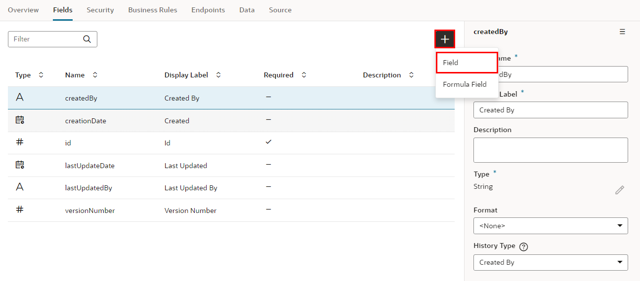 「Fields」 タブ・ページの 「+」 ボタンから「Field」をクリックします。