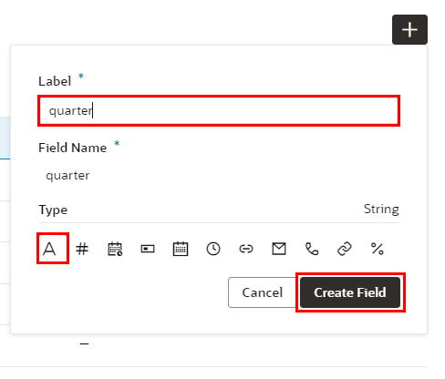 | 「Field Name」 | quarter | 追加するフィールドを識別するための名前。Labelを入力すると自動的に設定されます。 |