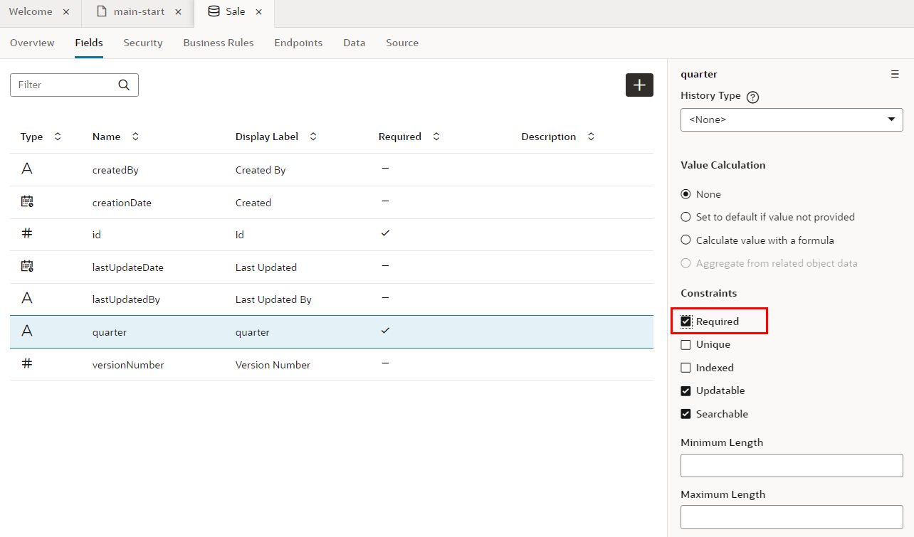 プロパティ・エディタで 「Required」 をチェックすると、フィールド quarter は必須データ項目に設定されます。 レコードの作成や編集フォームで、値が入力されているかどうか自動的にチェックされるようになります。フィールドquarterの「Required」 列にチェック・マークが表示されていることを確認します。