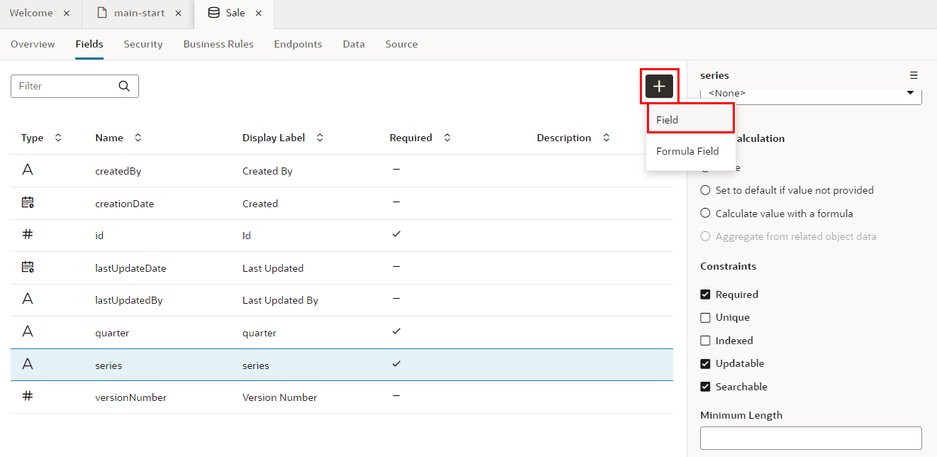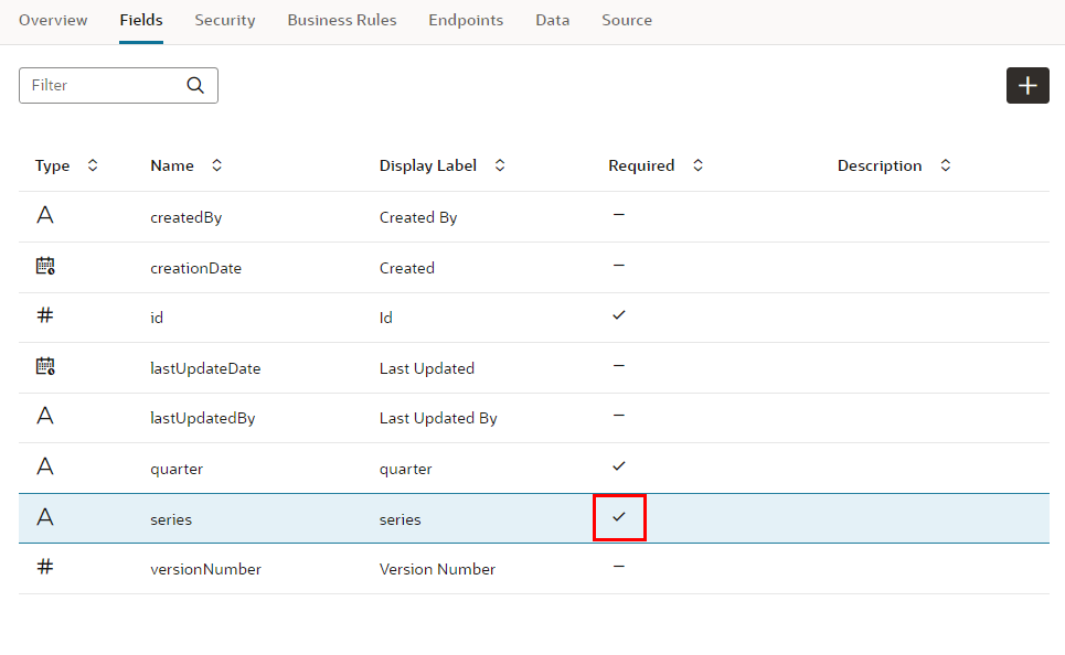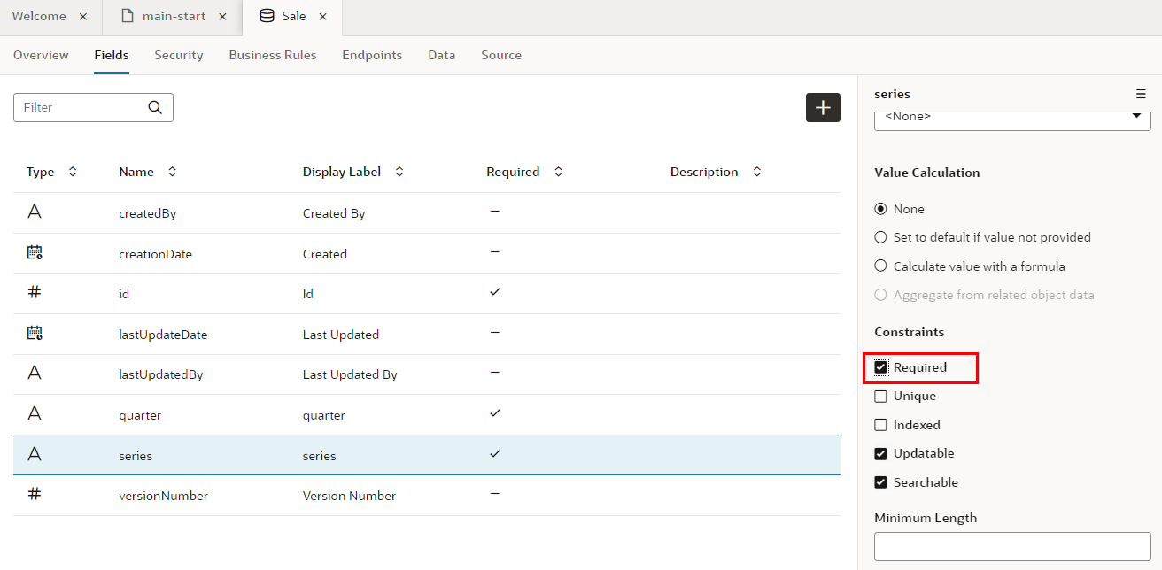 プロパティ・エディタで 「Required」 をチェックすると、フィールドseriesは必須データ項目に設定されます。 レコードの作成や編集フォームで、値が入力されているかどうか自動的にチェックされるようになります。フィールドseriesの「Required」 列にチェック・マークが表示されていることを確認します。