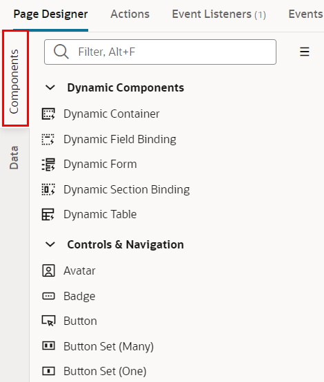 アプリケーション・デザイナの左側には、コンポーネント・パレットが表示されます。 コンポーネント・パレットは、デザイナの左にあるコンポーネントタブで表示/非表示を切り替えることができます。