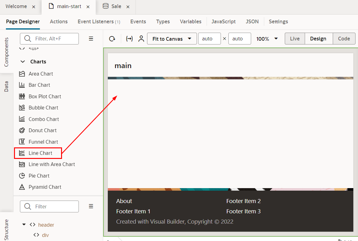 コンポーネント・パレットを下にスクロールし、「Charts」 カテゴリの「Line Chart」コンポーネントを、タイトルの下にドラッグ&ドロップします。