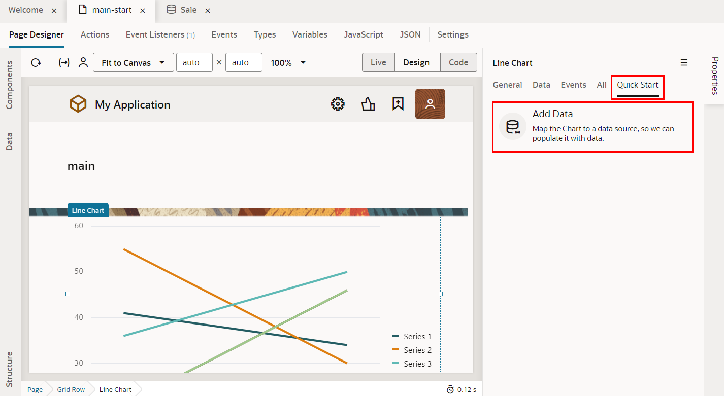 追加されたLine Chartコンポーネントのプロパティ・インスペクタでQuick Startタブを開き、「Add Data」をクリックします。