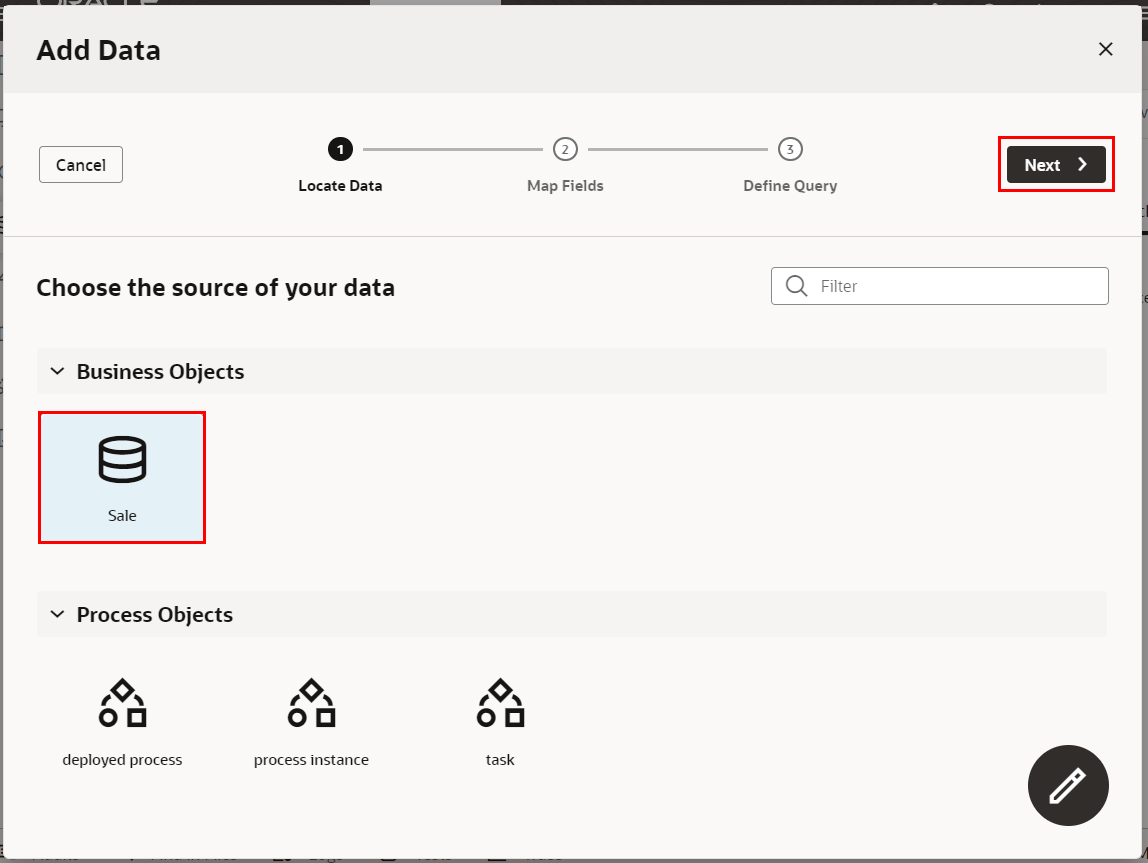 ここでは、売上を表すビジネス・オブジェクト Sale を作成します。 次に、作成したビジネス・オブジェクトにフィールドを追加します。 最後に、CSV ファイルからデータをインポートします。