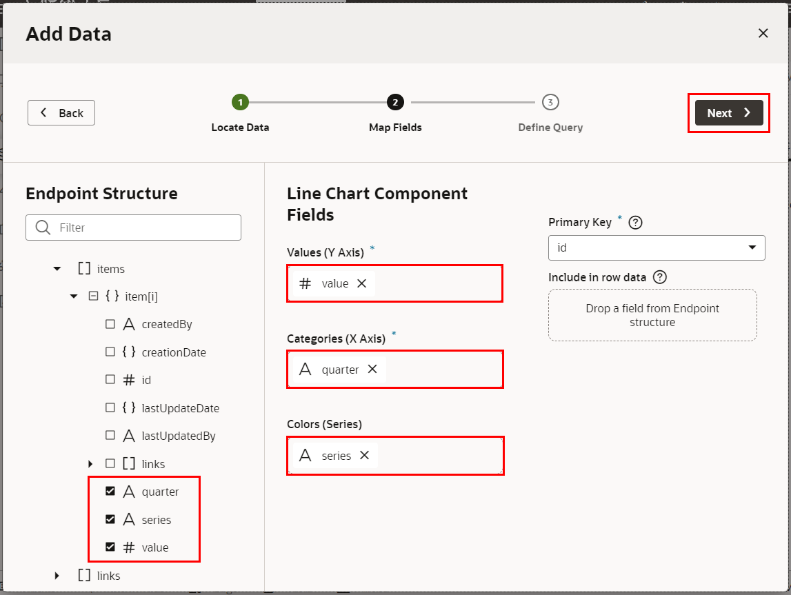 「Add Data」ダイアログ・ボックスの「Map Fields」ページでは、Line ChartコンポーネントのX軸、Y軸、およびシリーズデータを選択します。画面左側の「Endpoint Structure」で「item[i]」ノードの下の「value」、「quarter」と 「series」を順番にチェックします。「Line Chart Component Fields」 リストの下に、「value」、「quarter」と 「series」が順番に追加されていることを確認したら、「Next > 」 ボタンをクリックします。