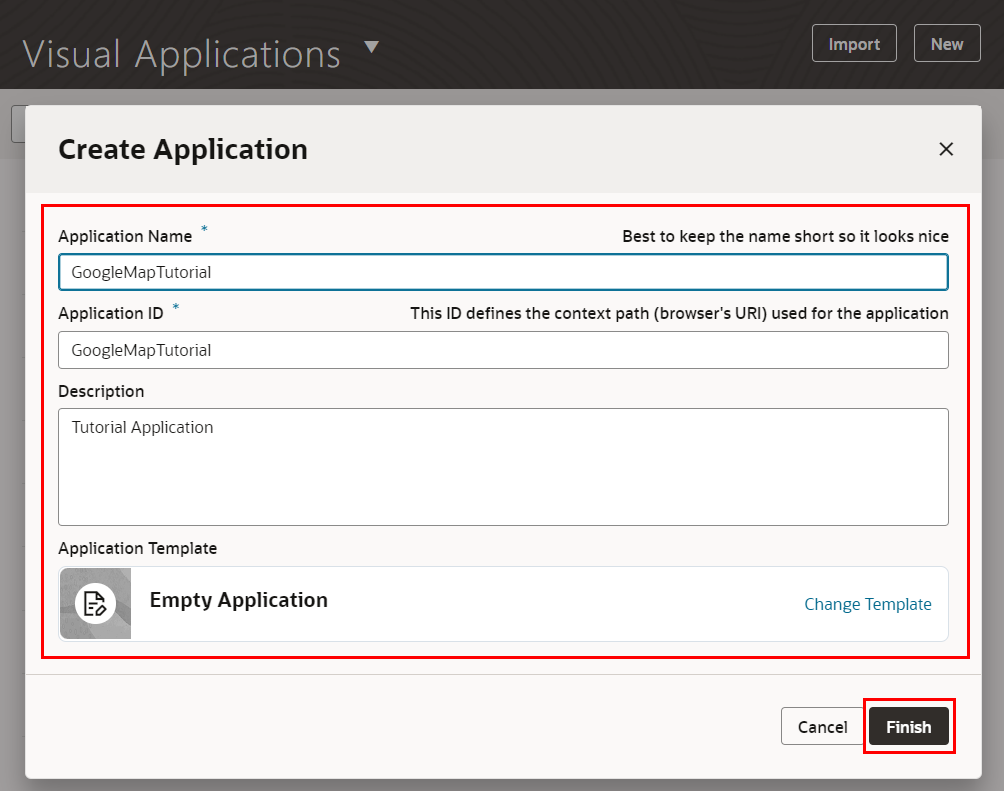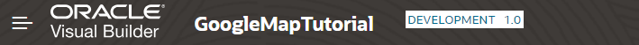 | 「Id」 | GoogleMapTutorial | アプリケーションのID。アプリケーションのURLにも用いられるので、VBCSのインスタンス内で一意である必要があります。 |