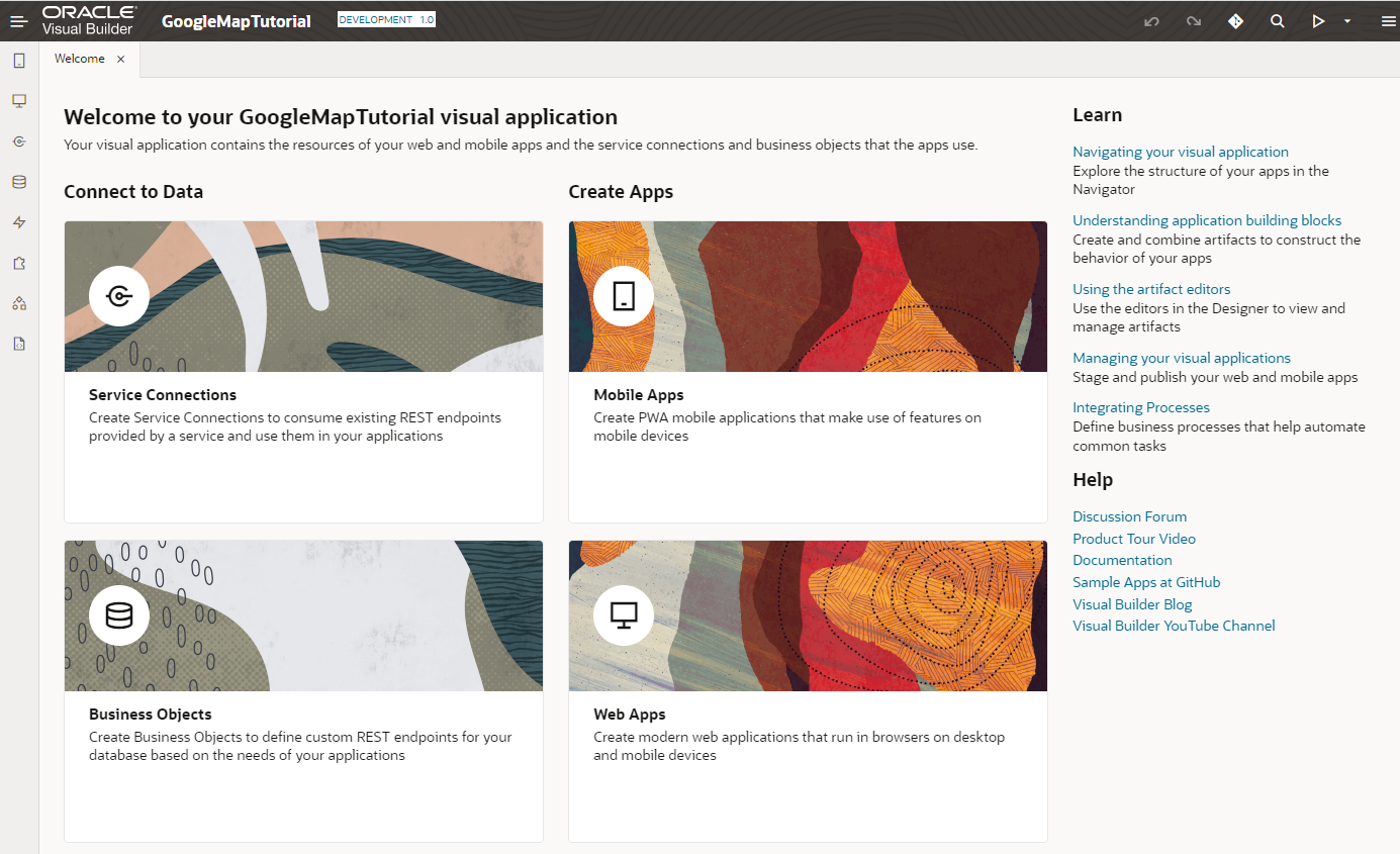 ビジュアル・アプリケーションが作成されると、VBCSのアプリケーション・デザイナでビジュアル・アプリケーションがオープンします。アプリケーション・デザイナにはアーティファクト・ブラウザとWelcomeスクリーンが表示されます。Welcomeスクリーンには、VBCSでアプリケーションを作成するためのタスクのガイドが表示されます。