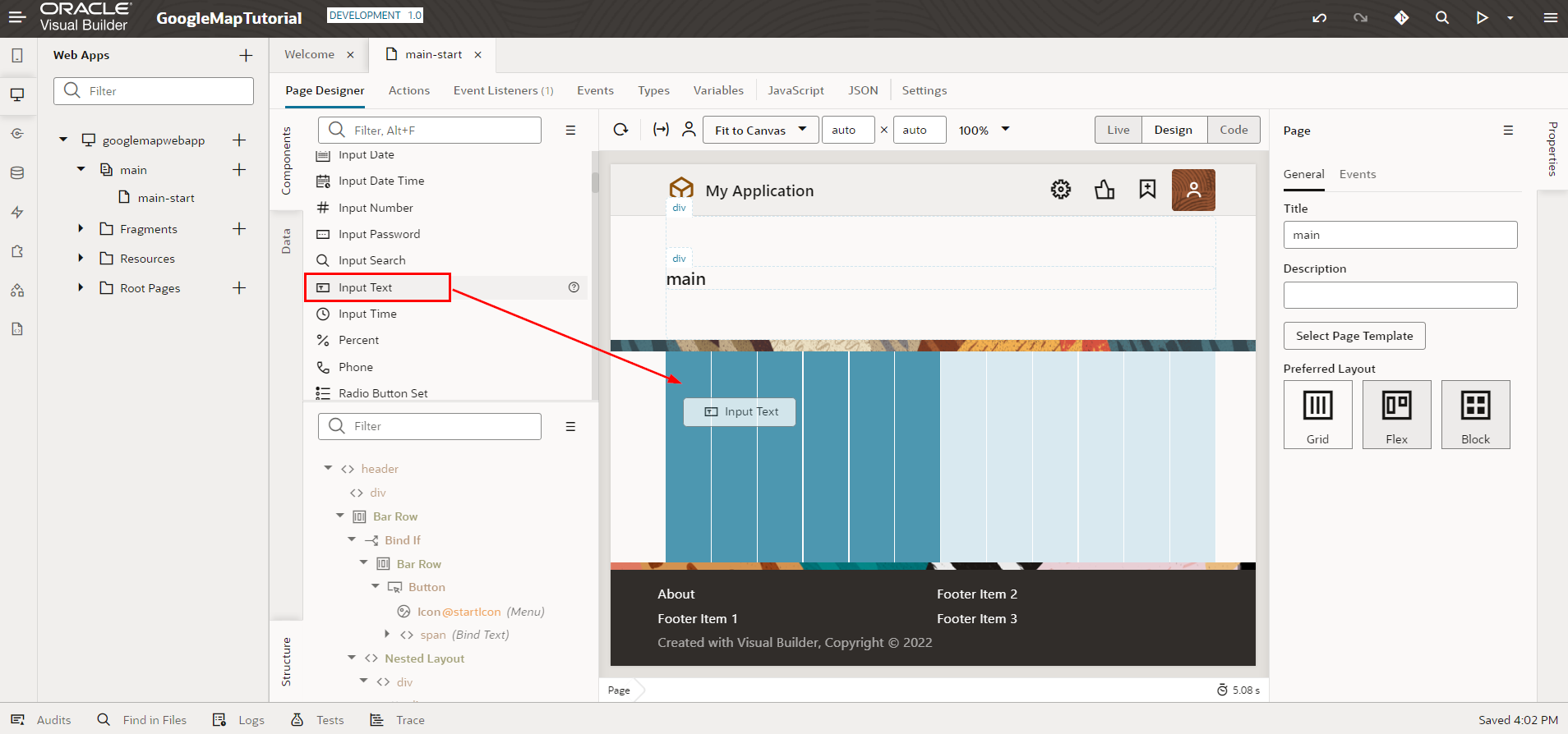 GoogleMapWebAppアプリケーションのアーティファクトが生成されます。ページ・デザイナで表示されている「main-start」が、アプリケーションの起動時に最初に表示される画面です。