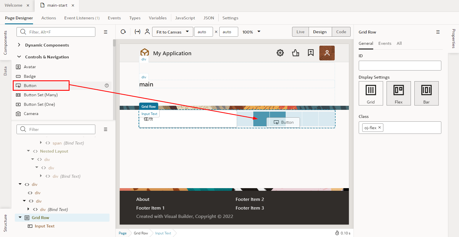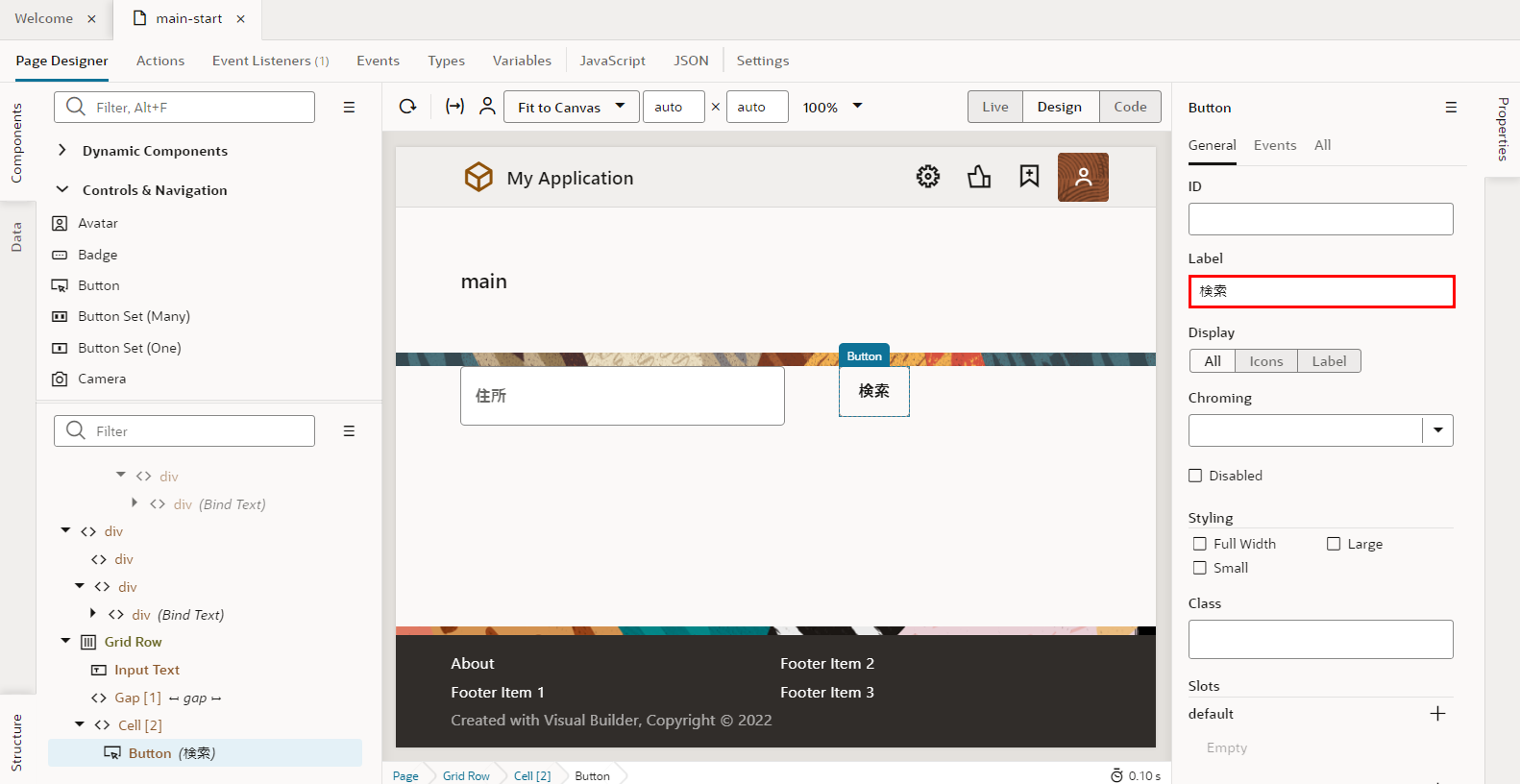 コンポーネント・パレットを上にスクロールし、「Controls & Navigation」カテゴリの「Button」コンポーネントを、住所の1列幅の右側にドラッグ&ドロップします。Buttonコンポーネントの幅を2列にします。